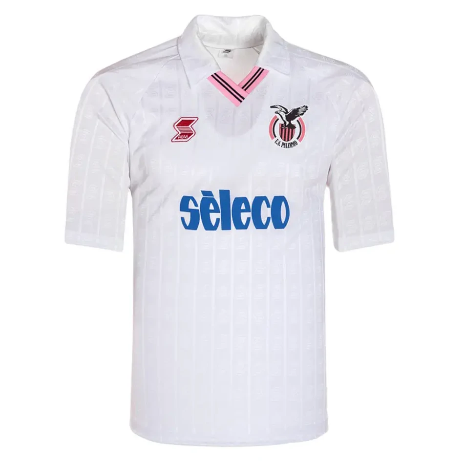 This is the official US Palermo retro away shirt 1991-1992 from ABM for adults. This Palermo retro football shirt is based on the away shirt that was worn in the 1991/91 season. The white US Palermo vintage football shirt has short sleeves and a polo collar with a v-neck. The v-neck is white with pink stripes. The name of the then sponsor SELECO is in the middle of the chest. The U.S. logo on the left chest. Palermo and the right one contains the logo of clothing sponsor ABM. Material: 100% polyester.