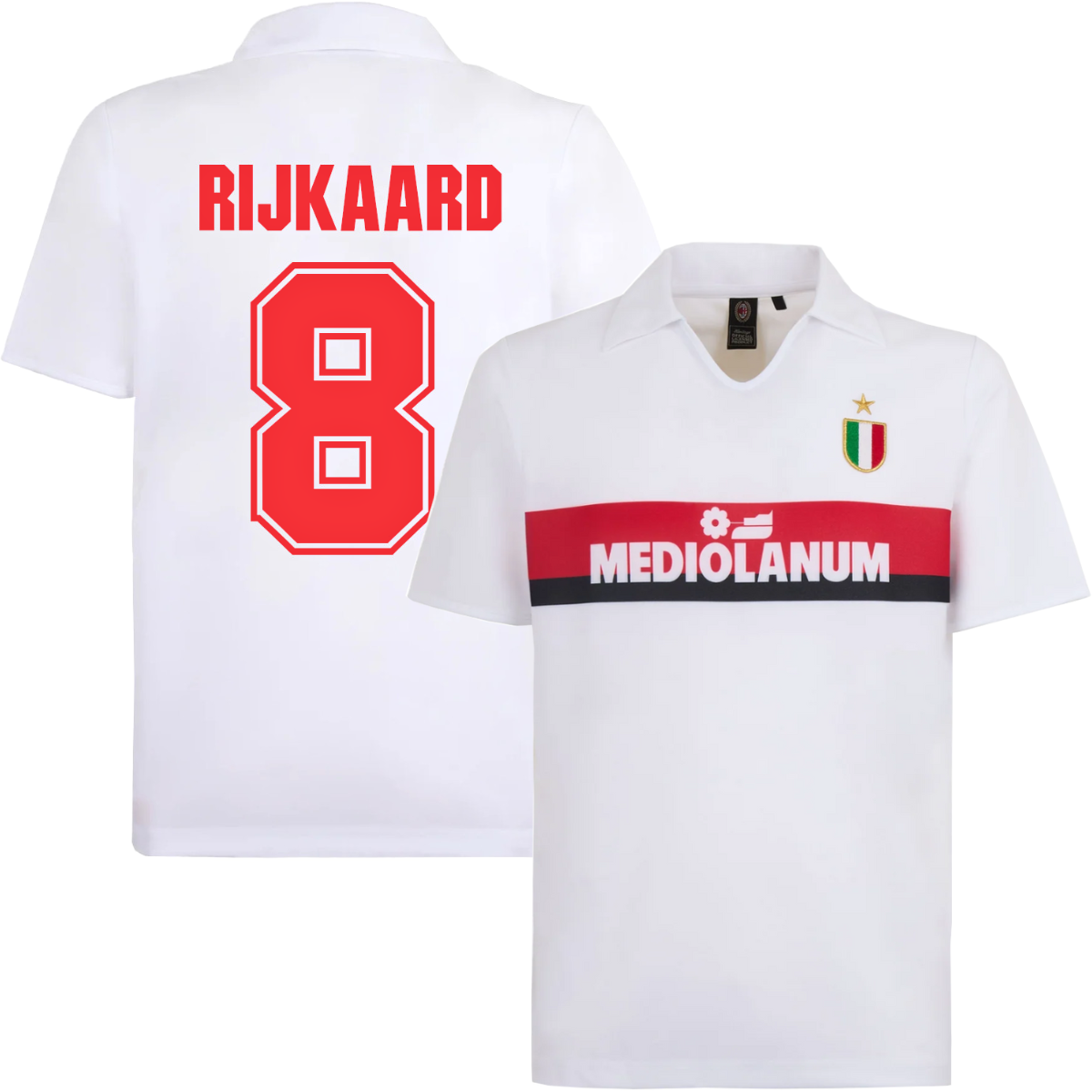 This is the official AC Milan retro away shirt 1988/89 by Score Draw. The back features the print of star player Rijkaard (8). This AC Milan retro football shirt is based on the Milan away shirt from the 1988-89 season. Great classic Rossoneri retro football shirt in white. Very recognizable by the name of the then sponsor MEDIOLANUM. The name of the sponsor is applied to a horizontal plane in black with red. Furthermore, this AC Milan retro football shirt is decorated with a v-neck and a white polo collar. The left chest features the Scudetto badge with a gold star above it. Nice AC Milan football shirt for the real AC Milan fan! Material: 100% recycled polyester.