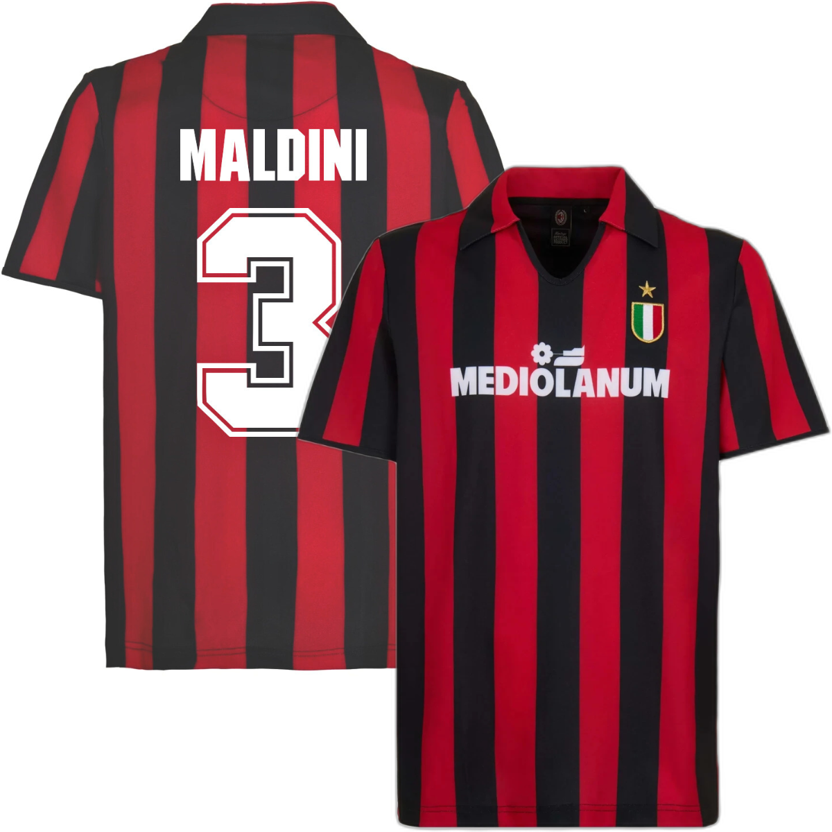 This is the official AC Milan retro football shirt 1988/89 by Score Draw. The back contains the print of star player Maldini (3). This Milan retro football shirt is based on the home shirt of Milan from the 1988-1989 season. Great classic Rossoneri retro football shirt in the well-known black and red vertical stripes. Very recognizable by the name of the then sponsor MEDIOLANUM. The left chest contains the Scudetto badge with a golden star above it. Furthermore, this AC Milan retro football shirt has a v-neck and a polo collar in red with black. Nice AC Milan football shirt for the real Milan fan! The AC Milan retro football shirt by Score Draw has a normal fit. Material: 100% recycled polyester.