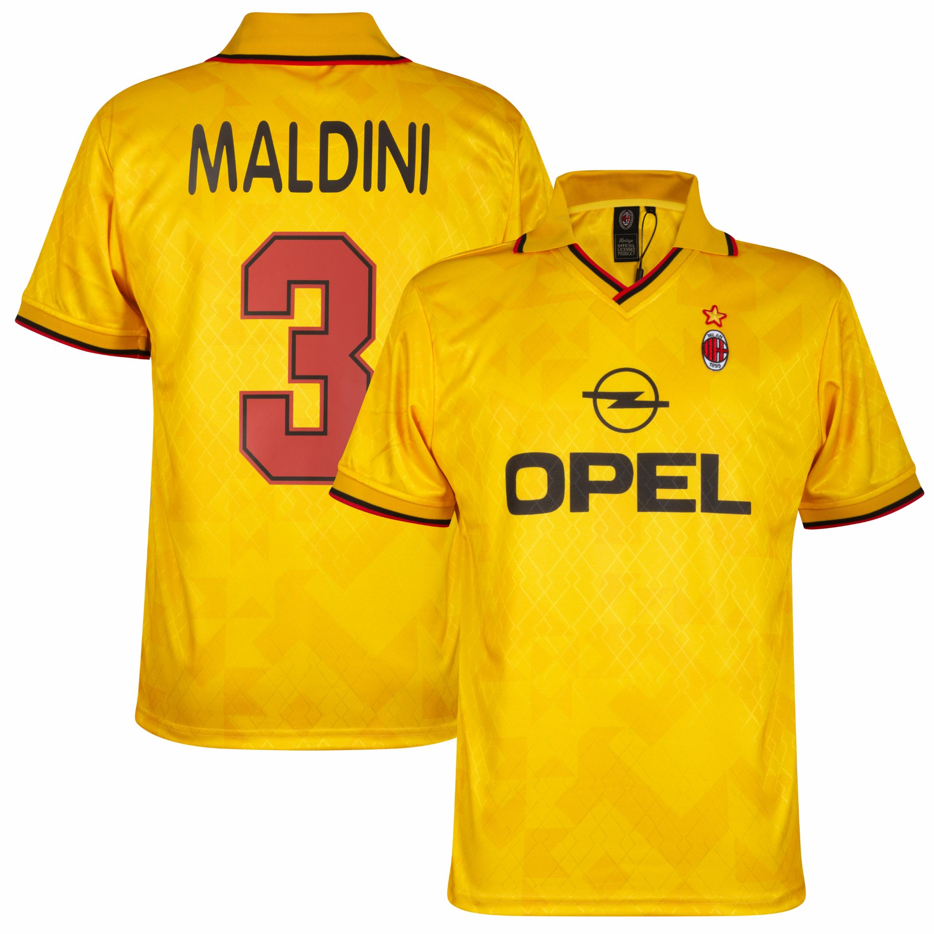 This is the official AC Milan 3rd retro football shirt 1995-1996. The back features the Maldini (3) print. This Milan retro football shirt is based on the AC Milan third football shirt from the 1995/96 season. The retro football shirt is predominantly yellow. The name of the then-sponsor, OPEL, is printed in the center. The left chest features the AC Milan logo with a gold star above it. Furthermore, this AC Milan retro football shirt features a V-neck and polo collar with a red and black line. The piping also features these colors. A fantastic AC Milan football shirt for the true Milan fan! The AC Milan retro football shirt from COPA Football has a regular fit. Material: 100% recycled polyester.