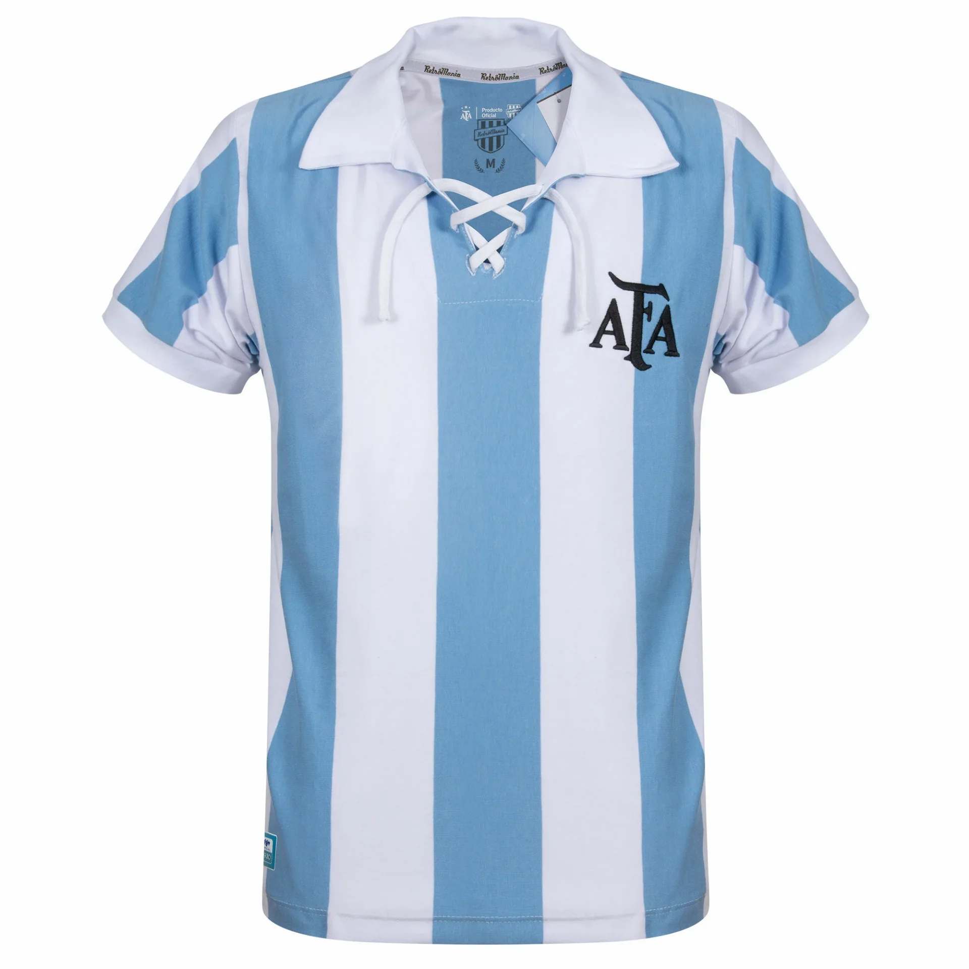 Argentina retro football shirt World Cup 1930 for adults. On the left chest are the initials of the Argentine Football Association AFA. The shirt features the iconic light blue and white stripes. Finished with a polo collar and a lace-up retro neckline. Regular fit. Material: 100 percent cotton.
