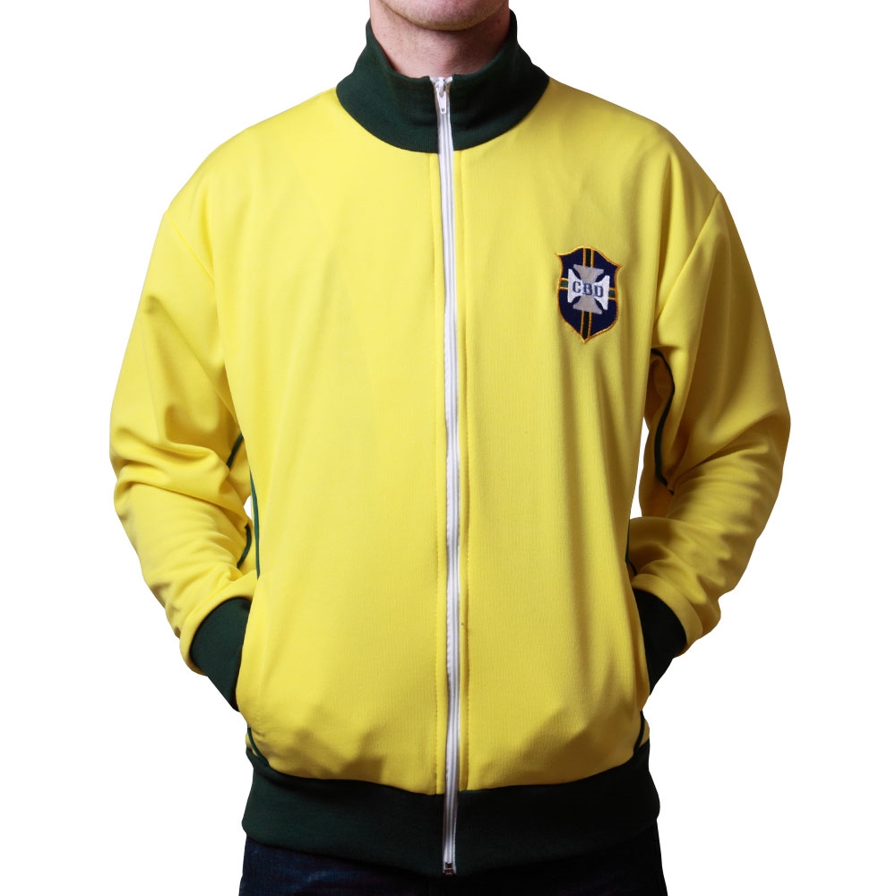 This is the Brazil retro track jacket from TOFFS. The retro jacket is based on the jacket of the Brazil national football team. Beautiful yellow retro football jacket with white zipper and the jacket also contains two side pockets. The Brazil retro track jacket also contains dark green trims and a green collar. On the left chest the emblem of the Brazilian Football Association. The Toffs retro jackets have a regular fit. 100% polyester.