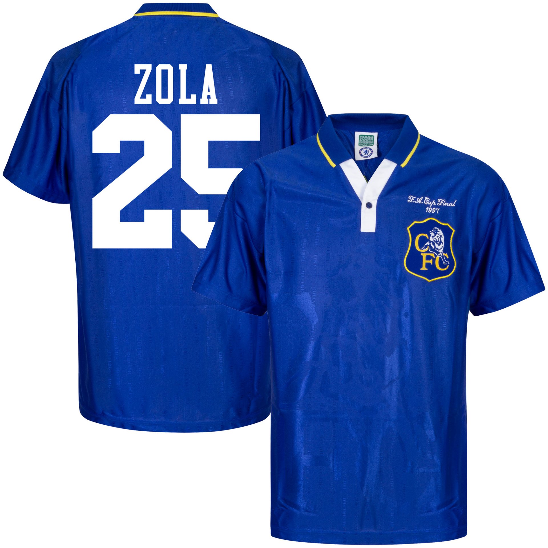 Relive one of the most memorable seasons in the club's history with the Score Draw 1996/97 Chelsea retro football shirt for adults. This official retro shirt pays tribute to the iconic kit Chelsea wore in the season they lifted the FA Cup. A must-have for Blues supporters and classic football shirt collectors. The back features a print of legendary footballer Zola (25).