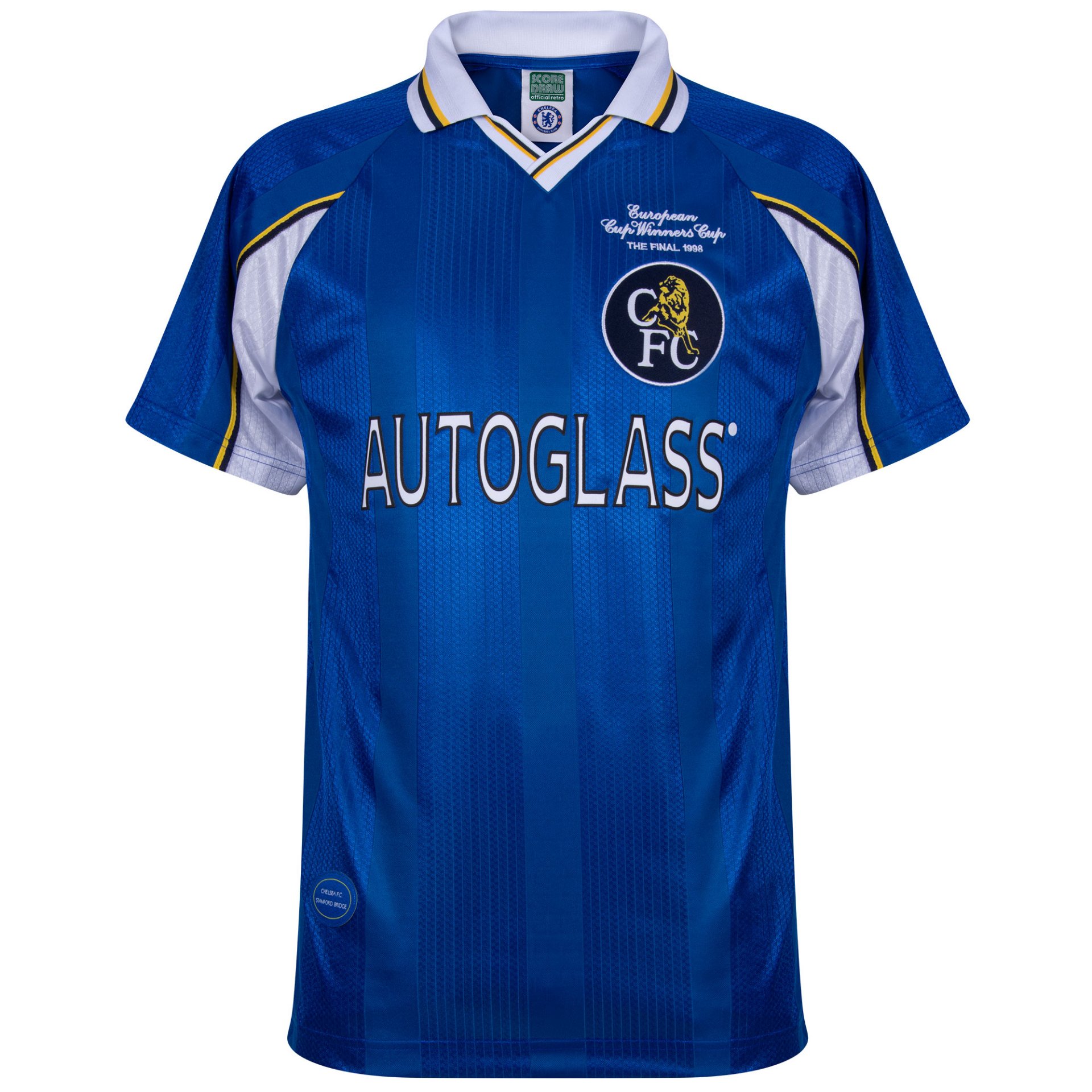 The shirt features the classic blue club colour with white and yellow accents. White underarm panels and a yellow sleeve stripe reflect the original design. The white polo collar includes blue and yellow detailing. The historic sponsor AUTOGLASS appears across the chest. The club crest features the text European Cup Winners Cup The Final 1998, celebrating the victory over Stuttgart.