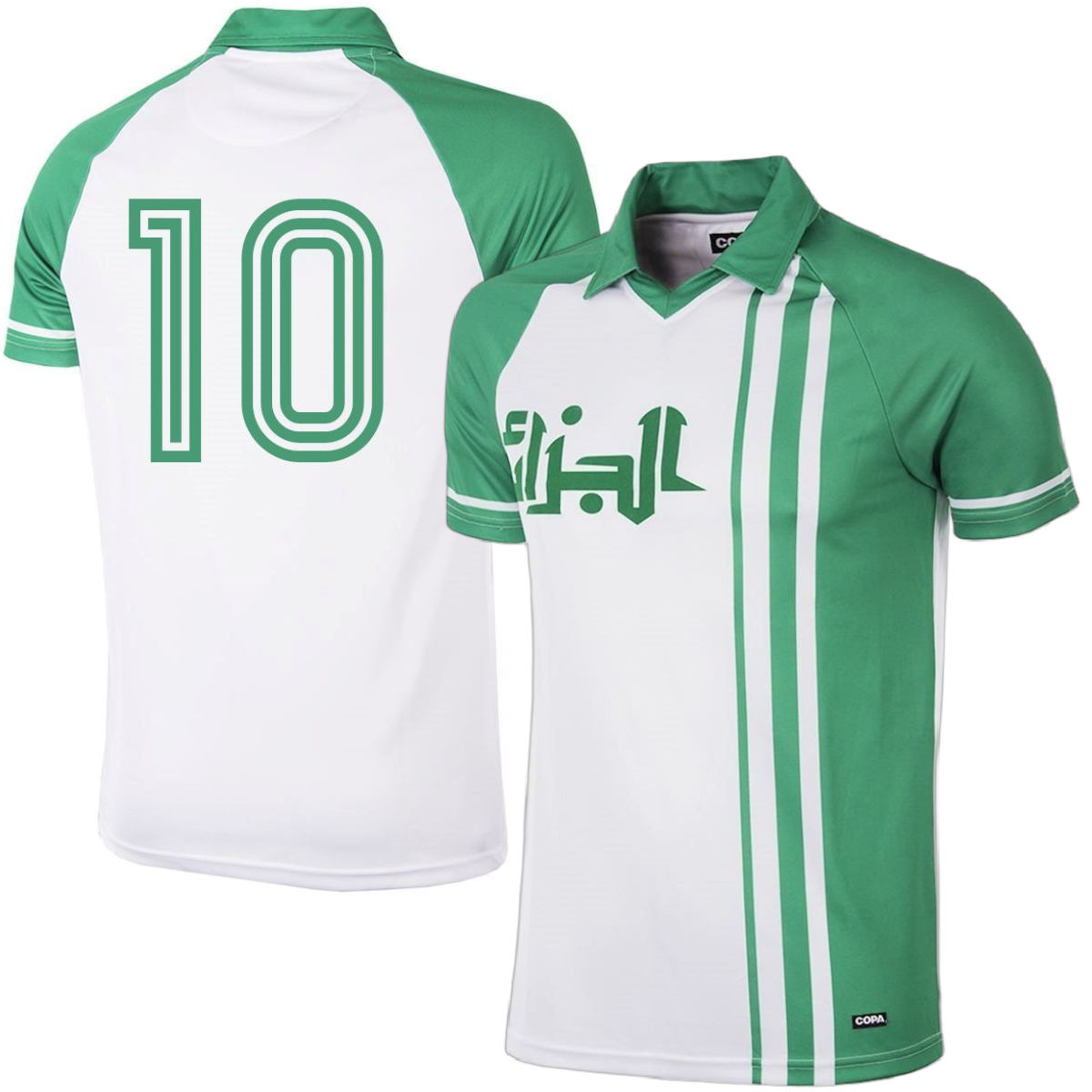 This is the Algeria retro football shirt from COPA Football. The shirt is based on the shirt that was worn during the World Cup in 1982. The back has number 10. During the World Cup in Spain in 1982, Algeria made its debut at a World Cup. Beautiful white and green retro shirt from Algeria with short sleeves and a large green collar. On the chest, Algerian text in green. The COPA retro shirts have a regular fit and come in a luxurious COPA gift box! Ideal for the true Algeria fan! 100% Polyester.