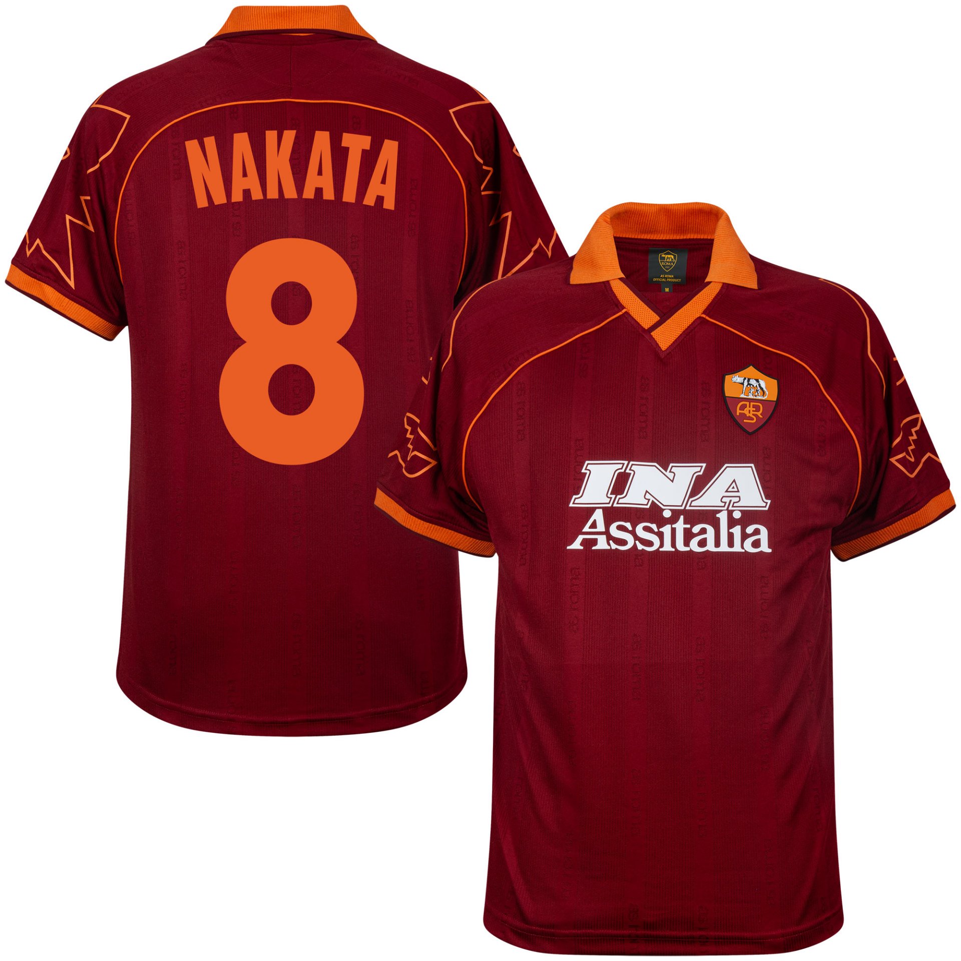 AS Roma retro football shirt 1999-2000 by COPA Football from the official AS Roma collection. The back features the print of AS Roma legend Nakata (8). This AS Roma retro shirt is based on the AS Roma home shirt from the 1999/00 season. The AS Roma retro football shirt has short sleeves and features the traditional dark red color. This football shirt is characterized by the orange Roman wolf on both sleeves. The polo collar and piping are orange. The name of the then-sponsor, INA Assitalia, is printed in the center of the chest. On the left chest is the logo of the football club from Rome with the famous Roman wolf. This AS Roma football shirt was worn by players such as Montella, Totti, Delvecchio, Cafu, Aldair, Nakata, and other star players. Material: 100% polyester.