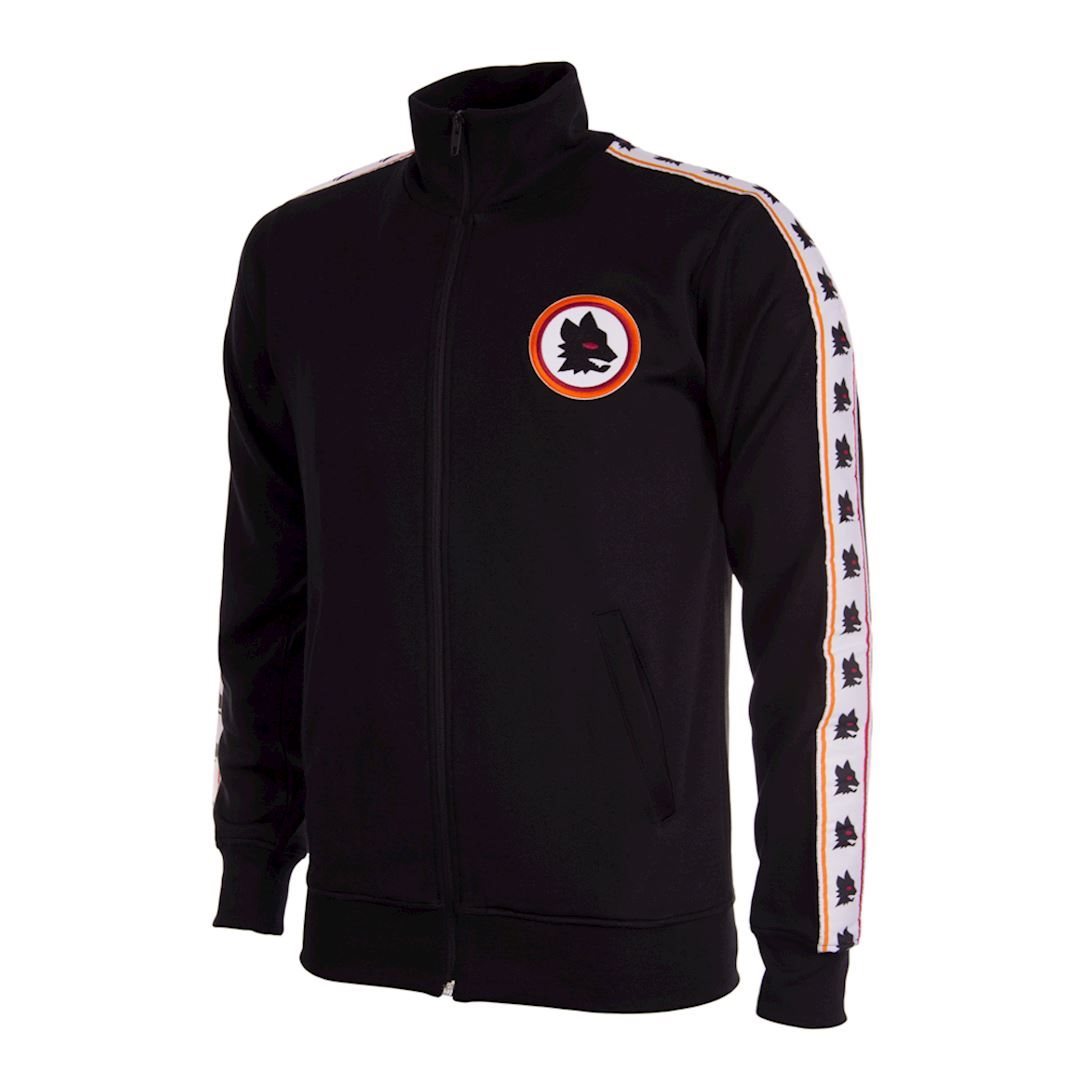 Black AS Roma training jacket by COPA Football from the official AS Roma collection. This AS Roma jacket is characterized by the white taping over both shoulders and sleeves. The tape is characterized by the image of the Roman wolf (Lupetto) and the red and orange stripes. Lupetto badge on the left chest. In addition, this COPA jacket has two side pockets.