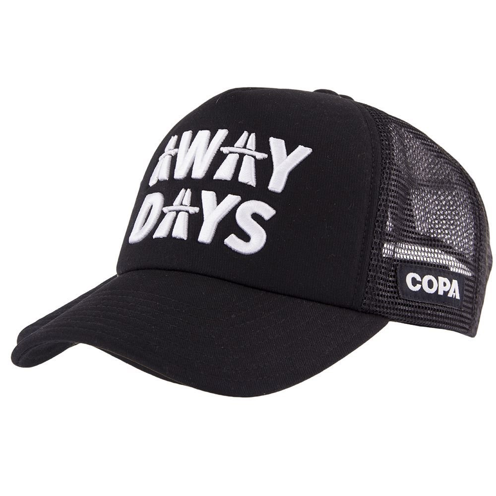Black COPA Football trucker cap. On the front a 3D logo in white with the text: AWAY DAYS. The side of the cap features the COPA logo. The trucker cap is a classic American cap, with a curved visor/visor for optimal comfort. Tough and sporty trucker cap from COPA, ideal for sun protection. 60% Polyester - 40% Nylon.