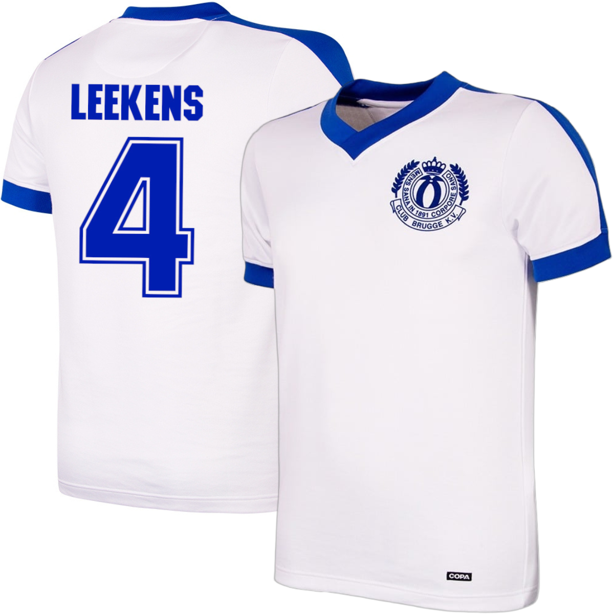 Club Brugge retro football shirt 1978 by COPA Football. The Club Brugge retro football shirt is based on the shirt worn during the European Cup final at Wembley during the 1977-78 season. The Club Brugge retro football shirt is predominantly white with blue accents. The back features the name of Brugge legend Leekens and number 4. The V-neck and piping are blue, as is the taping across the shoulders. The Club Brugge logo is on the left chest. The Club Brugge retro football shirt by COPA Football has a regular fit. Material: 50% cotton - 50% polyester.