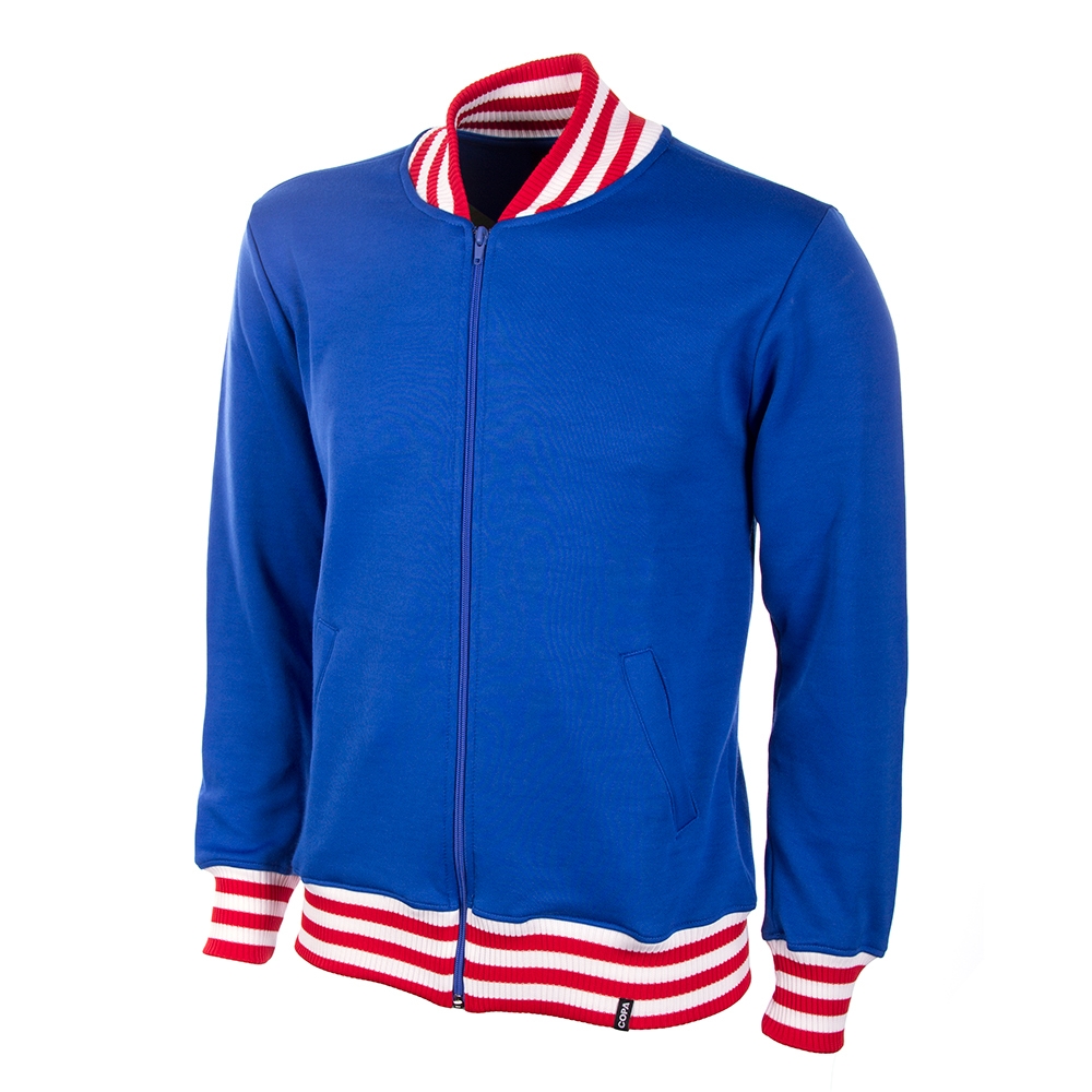 Sporty blue England retro jacket from COPA Football for men. The England retro training jacket is based on the jacket from the year 1966. This training jacket was worn by the players of England during the successful 1966 World Cup in their own country. The retro track jacket is predominantly blue with the text England in white on the back. Beautiful red/white trims on this cool training jacket from Copa Football. The baseball collar also contains these colors. Sporty England training jacket for the real fan! Material: 50% cotton - 50% polyester.