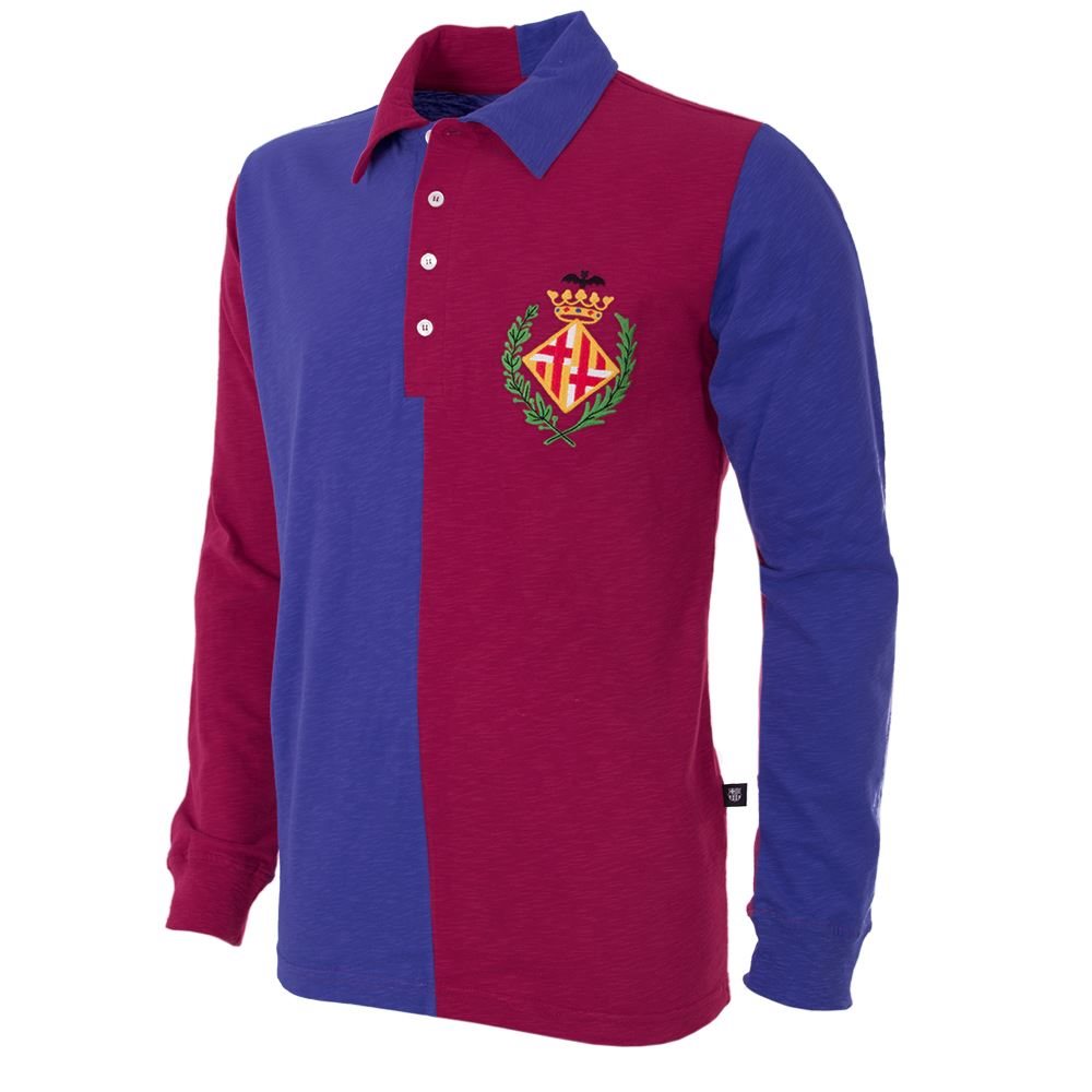 This FC Barcelona retro shirt from the COPA Football brand is based on FC Barcelona's very first football shirt. This Barcelona 1899 retro shirt has long sleeves and is half blue and half dark red. In addition, the retro shirt has four buttons and a large collar. The left chest features the first FC Barcelona logo. This logo would adorn the Barcelona shirt from 1899 to 1910. The logo consists of a diamond-shaped coat of arms surmounted by the crown of Aragon and the bat of King James. These are surrounded by two branches, a bay tree and a palm. The shirt colors are believed to be from FC Basel colors. Founder Joan Gamper came from Switzerland and determined the colors of the Catalan football club from the very beginning. 100% cotton