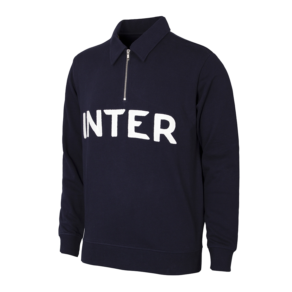 This is the official Inter Milan retro sweater from the brand COPA Football for men. This football sweater is based on the Inter training sweater from 1949 and was worn by the players of Internazionale during training. The Inter Milan sweater has a zipper up to the chest and this retro sweater is also characterized by the text INTER in the middle of the sweater under the zipper. Furthermore, this dark blue sweater has a polo collar. The football sweater comes in a luxury gift box from COPA Football. Ideal for the real Inter fan or retro lover. Material: 100% cotton.