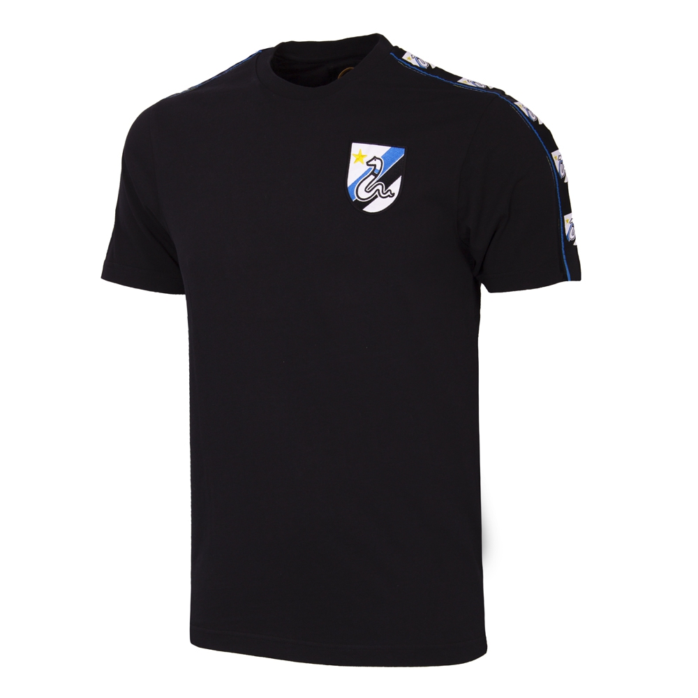 FC Internazionale t-shirt from the brand COPA Football for adults. The Inter Milan t-shirt is black and is characterized by a blue taping over the sleeves with the FC Internazionale logo on it. This logo is also on the left chest and was used by the Italian football club between 1979 and 1988. It is a white shield with two diagonal stripes in blue and black and the grass snake on it. This snake is a historical symbol of the city of Milan. In addition, the Inter Milan t-shirt has a round neck. Ideal for the real Inter fan! The t-shirt comes from the official FC Internazionale collection by COPA Football and has a wonderful retro look. Material: 100% cotton.