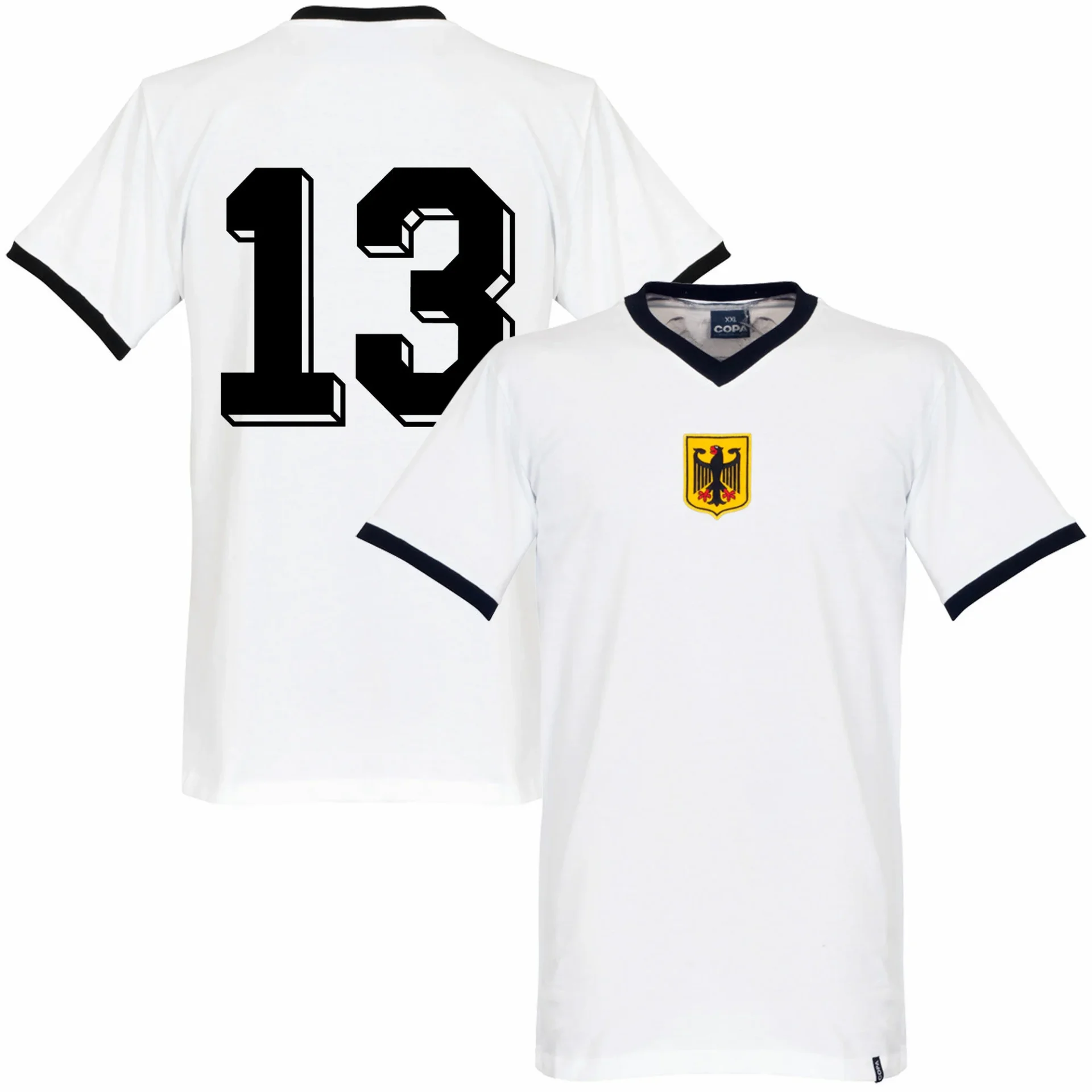 This is the West Germany retro shirt, based on the football shirts from the 1970s of the West Germany national football team. This Germany shirt has a number 13 in the style of the shirts from that period. Great retro shirt from Germany with the proud black eagle in the middle of the chest. This v-neck retro shirt from the Germans has short sleeves. The v-neckline and trims are in black. Cool COPA retro shirt for the real Die Mannschaft fan! The COPA retro shirts have a regular fit. 100% cotton.