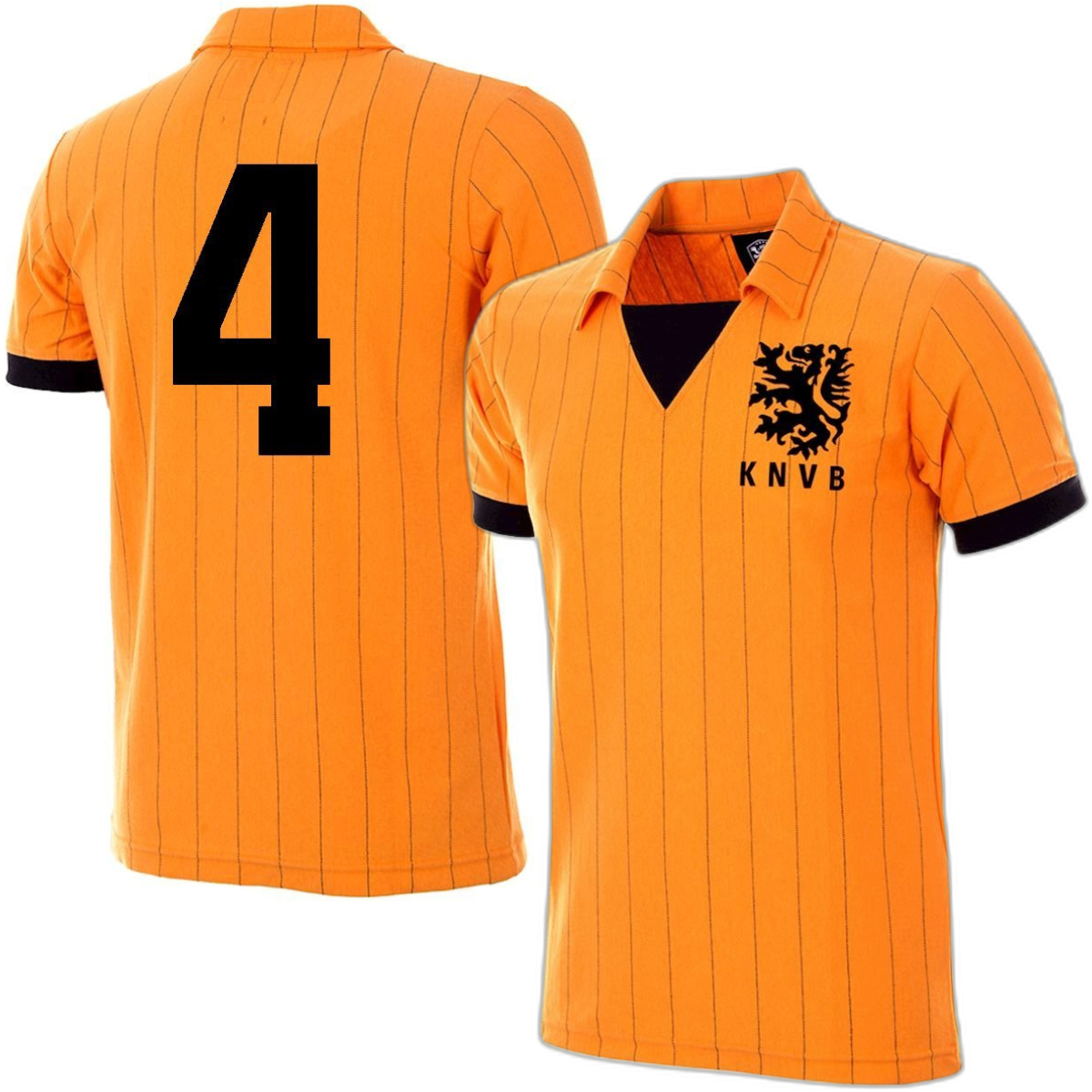 Dutch National Team retro football shirt by COPA Football from the official KNVB collection. This retro shirt is based on the football shirt that was worn in 1983. The shirt has number 4 on the back. This Holland retro shirt is predominantly orange and is characterized by the thin black vertical lines. In addition, the retro shirt contains black piping and a polo collar. The neck has a square black area. On the left chest a beautiful Holland emblem of the famous lion with the initials of the Royal Dutch Football Association (KNVB) underneath. Cool Dutch national team football shirt for the real Orange fan! The retro shirts from COPA have a normal fit. Nice shirt for King's Day, a European Championship or a World Cup.