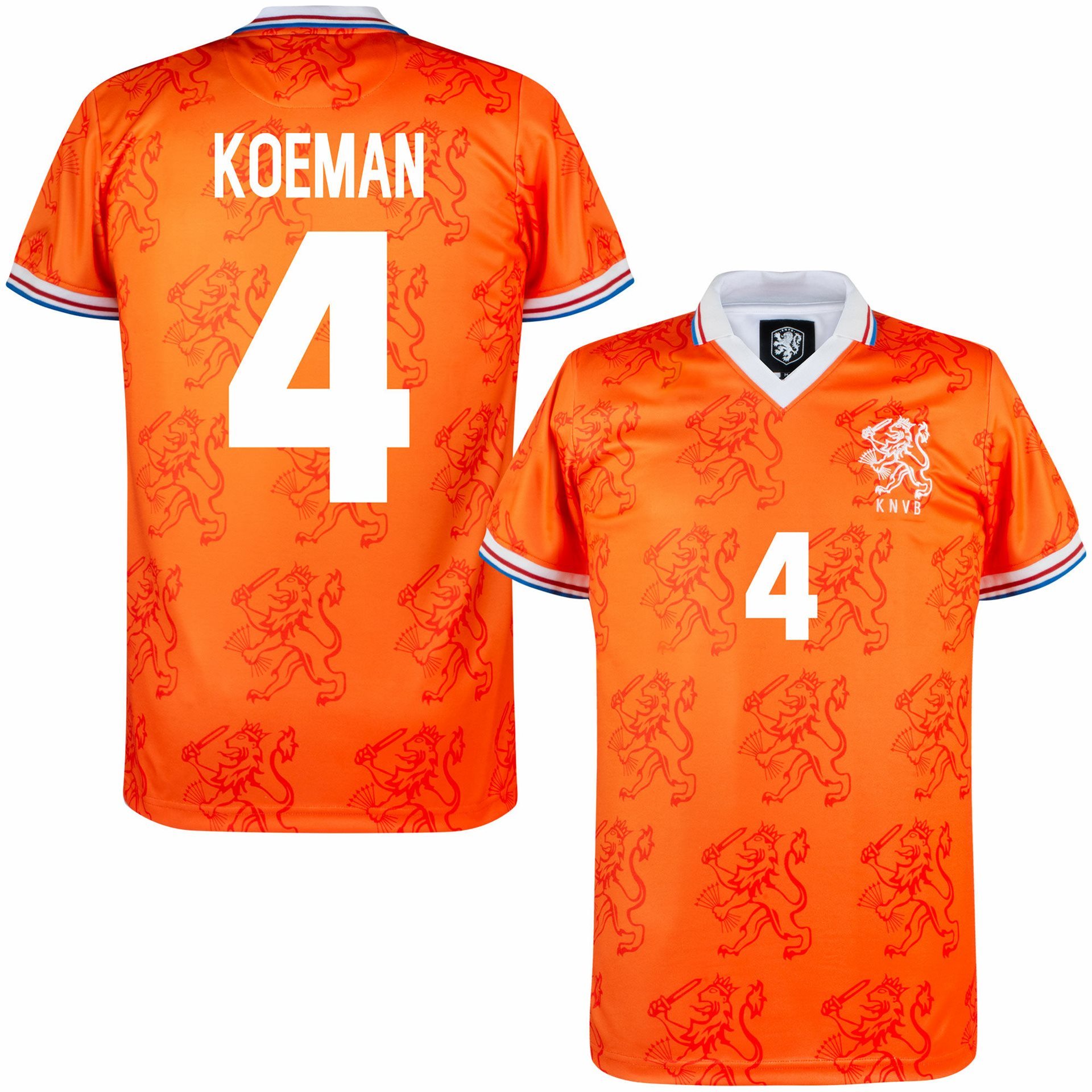 Dutch national team retro football shirt from COPA Football from the official KNVB collection. The shirt has the name Koeman and number 4. This shirt also contains a breast number 3. This retro shirt is based on the football shirt that was worn during the 1994 World Cup in America. The Holland retro shirt is predominantly orange and is characterized by an all-over print of the lion from the KNVB logo. This logo is also applied in white on the left chest. Furthermore, the shirt has a polo collar and a v-neck. The polo collar and piping are in the colors of the Dutch flag, red-white-blue. Cool Dutch national team retro football shirt for the real Orange fan! The COPA retro shirts have a regular fit. Nice shirt for King's Day, a European Championship or a World Cup football.