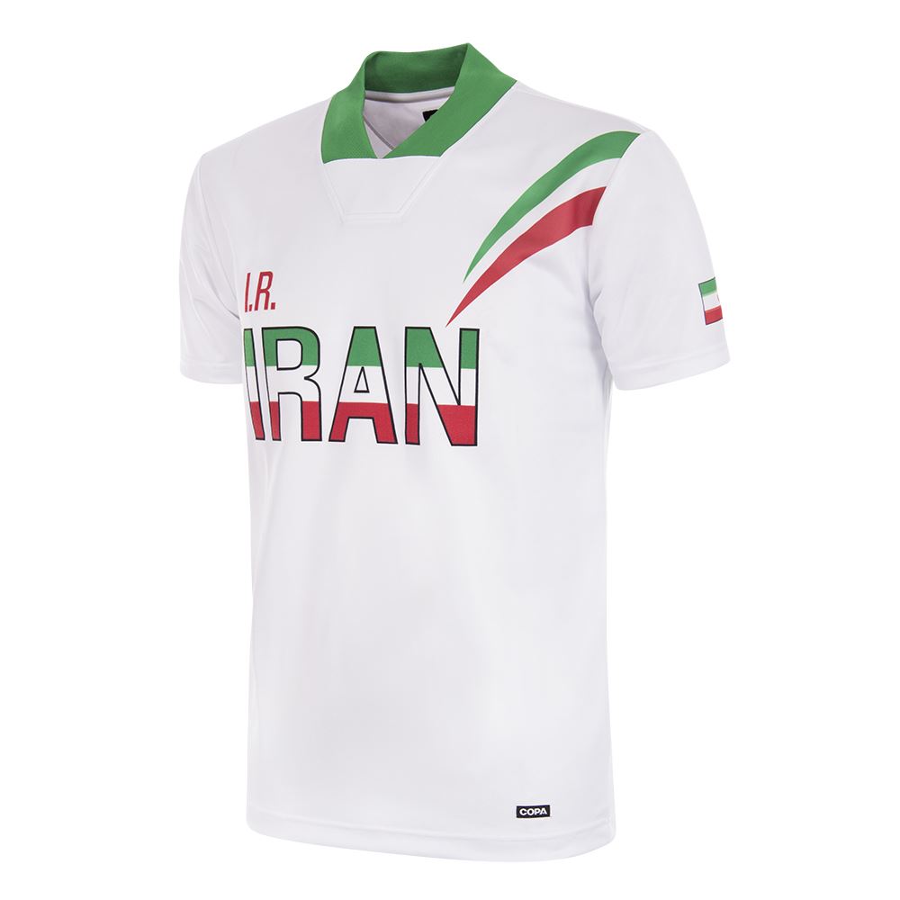 This is the Iran retro football shirt 1998 from COPA Football. The Iran retro shirt is based on the football shirt that was worn by Iran during the 1998 World Cup. The white Iran retro football shirt has short sleeves and a nice wide v-neck in green. In the middle of the chest the text IRAN in the colors of the country. On the right chest the initials I.R. The flag of Iran is applied to the left chest. In addition, the predominantly white retro shirt from Iran is characterized by the green and red stripes on the left chest. The retro football shirts from COPA Football have a normal fit and are delivered in a luxury gift box from COPA. Material: 100% Polyester.