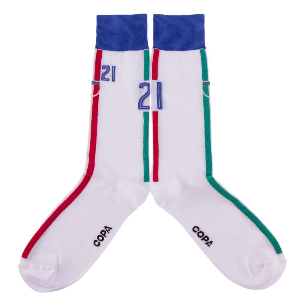Italy casual socks from the brand COPA Football. The COPA socks are based on the away shirt from Italy which was worn during the European Championship 2016 during the World Cup 2014. This European Championship ended for the Italians in the quarter finals, in which they eventually lost to Germany after penalties. The retro socks are white and have a blue top. In addition, the socks contain a red and a green stripe. Also number 21 and the badge of the Italian Football Association can be seen on the socks. The COPA socks are produced in Italy and are made of 85% cotton, 12% nylon and 3% lycra.