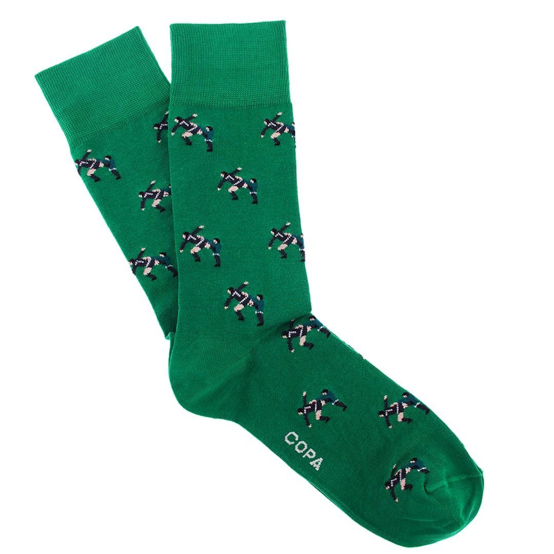 Cool and recognizable socks from the COPA Football brand. These COPA socks show a much-discussed promotion by Eric Cantona. The Frenchman employed by Manchester United was sent off by the referee during the away game against Crystal Palace. On the way to the locker room, Cantona kicked a Crystal Palace supporter with a Kung-Fu kick. This resulted in Cantona being suspended for 9 months and a penalty of 120 hours. The COPA socks are produced in Italy and are made of 85% cotton, 12% nylon and 3% lycra.