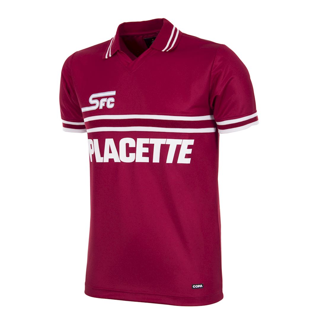 Classic Servette FC retro football shirt 1984/85 from COPA Football. The retro shirt is based on the football shirt of Servette FC from the 1984-1985 season. The Servette retro football shirt is mainly dark red with some white details. This white color is reflected in the two stripes on the polo collar and the piping. Two horizontal stripes on the center of the chest with the name of the then sponsor PLACETTE below and the initials of the Swiss football club, SFC, above it. The Servette FC retro shirt from COPA Football has a normal fit and comes in a luxury gift box. Material: 100% Polyester.