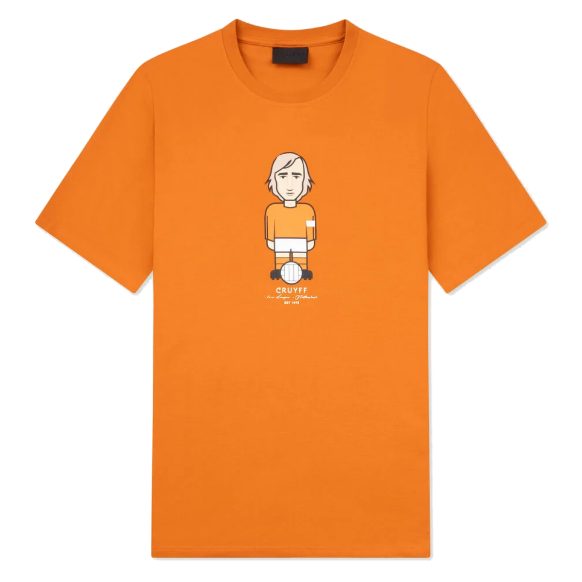 The front of the T-shirt features a striking graphic print of Johan Cruyff wearing the Netherlands national team kit. A powerful design that reflects his impact on world football. Cruyff made his debut for the Netherlands in 1966 and earned 48 international caps, scoring an impressive 33 goals. His brilliance at the 1974 World Cup led the Netherlands to the final and cemented his legendary status.