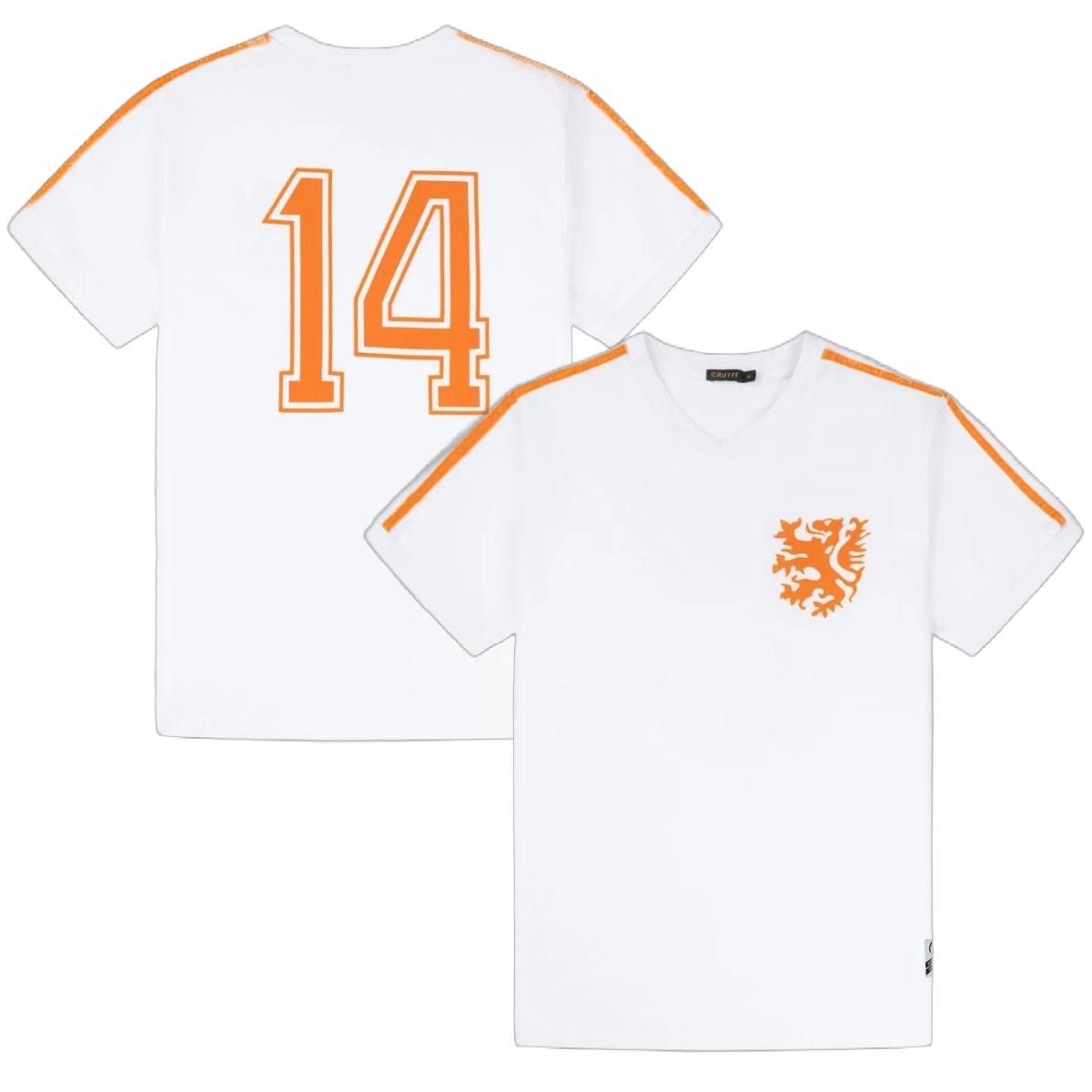 The shirt features a stylish white base, combined with the distinctive two orange stripes on the sleeves. The famous Dutch lion is proudly displayed on the left chest, symbolizing the Netherlands national team. On the back, you will find the iconic number 14, designed in the same style as worn by Cruyff himself during the 1974 World Cup.