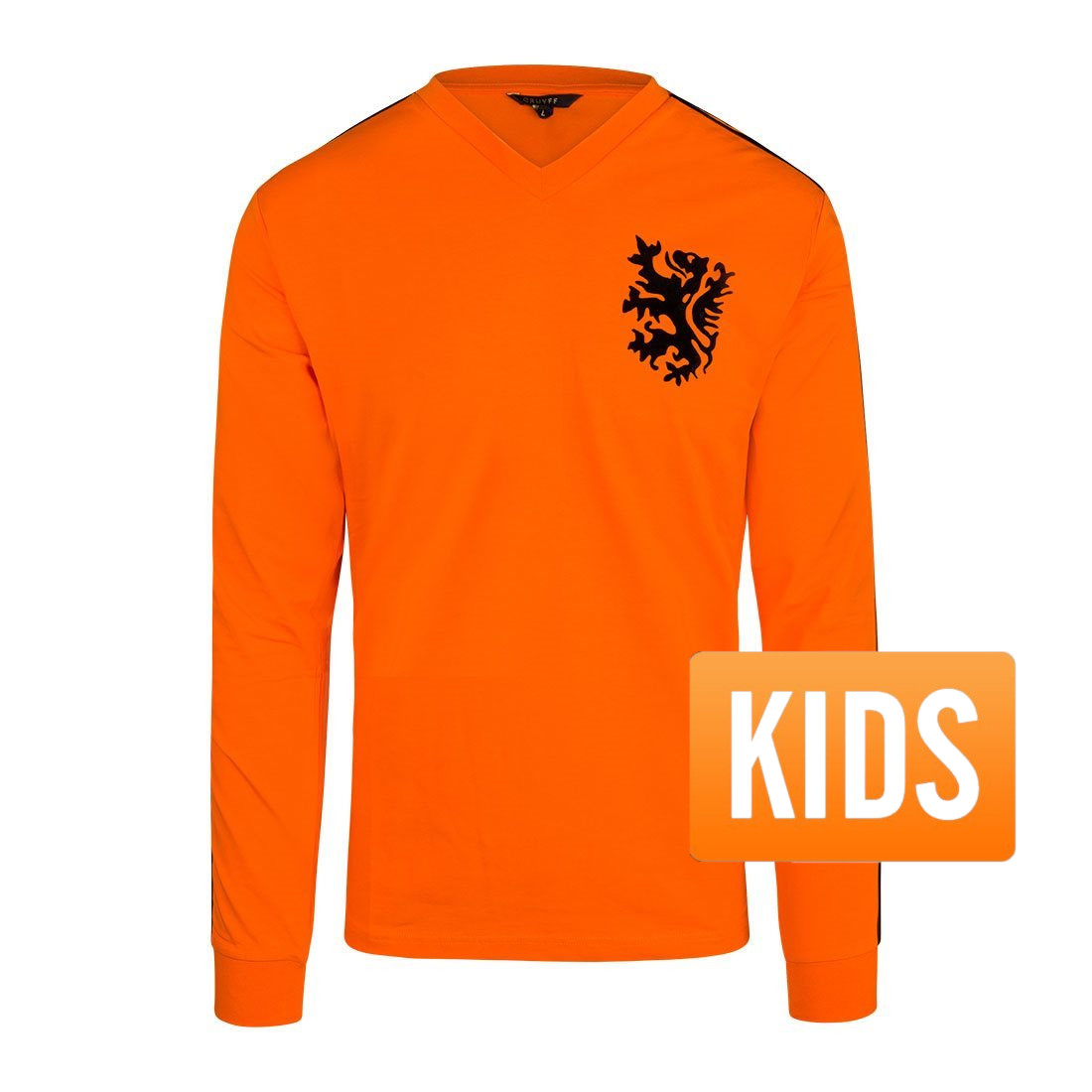 Nostalgic Dutch National Team retro football shirt from Cruyff for children. This concerns the shirt in children's sizes. The retro shirt is based on the football shirt worn by Johan Cruijff during the 1974 World Cup in Germany. The Holland retro shirt has long sleeves and has two black stripes over these sleeves. In addition, the shirt contains the well-known Dutch lion on the left chest. Of course the number 14 should not be missing on the back of this Cruyff shirt. This number is in the same style as Johan Cruijff wore during the matches during the World Cup in 1974. Material: 95% polyester - 5% elastane.