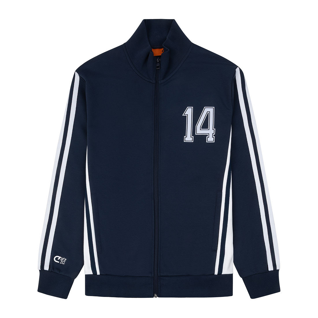 The design features a classic navy blue base with contrasting white accents. The white taping across both sleeves and along the sides of the jacket creates a sporty and authentic retro look. The iconic number 14 is featured on the left chest, making this jacket instantly recognizable as a tribute to Cruyff.