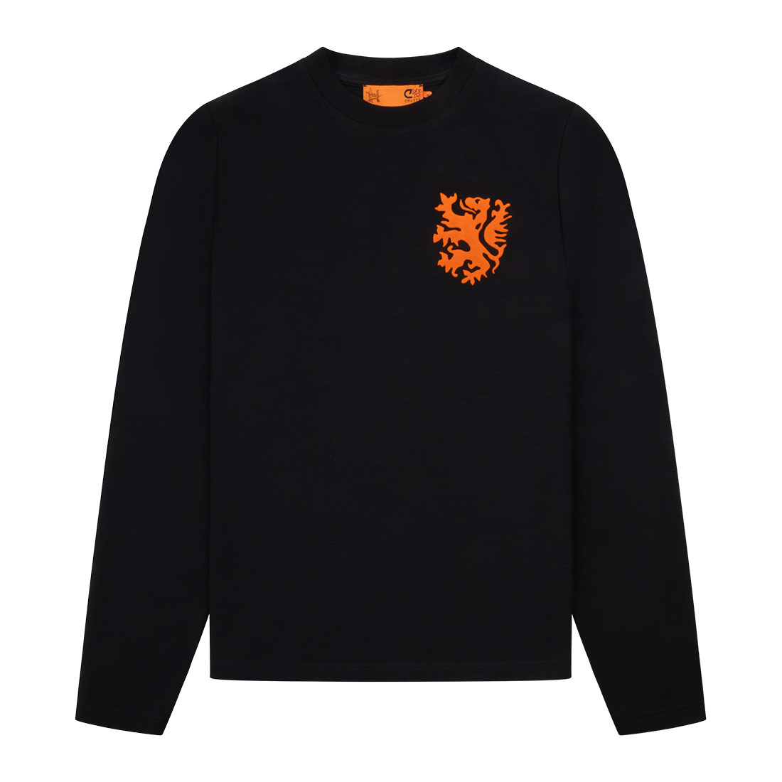 The shirt features long sleeves and a classic crew neck, creating a timeless and comfortable look. On the left chest, the Dutch lion appears in orange, standing out as a powerful and recognizable symbol of the Netherlands national team.