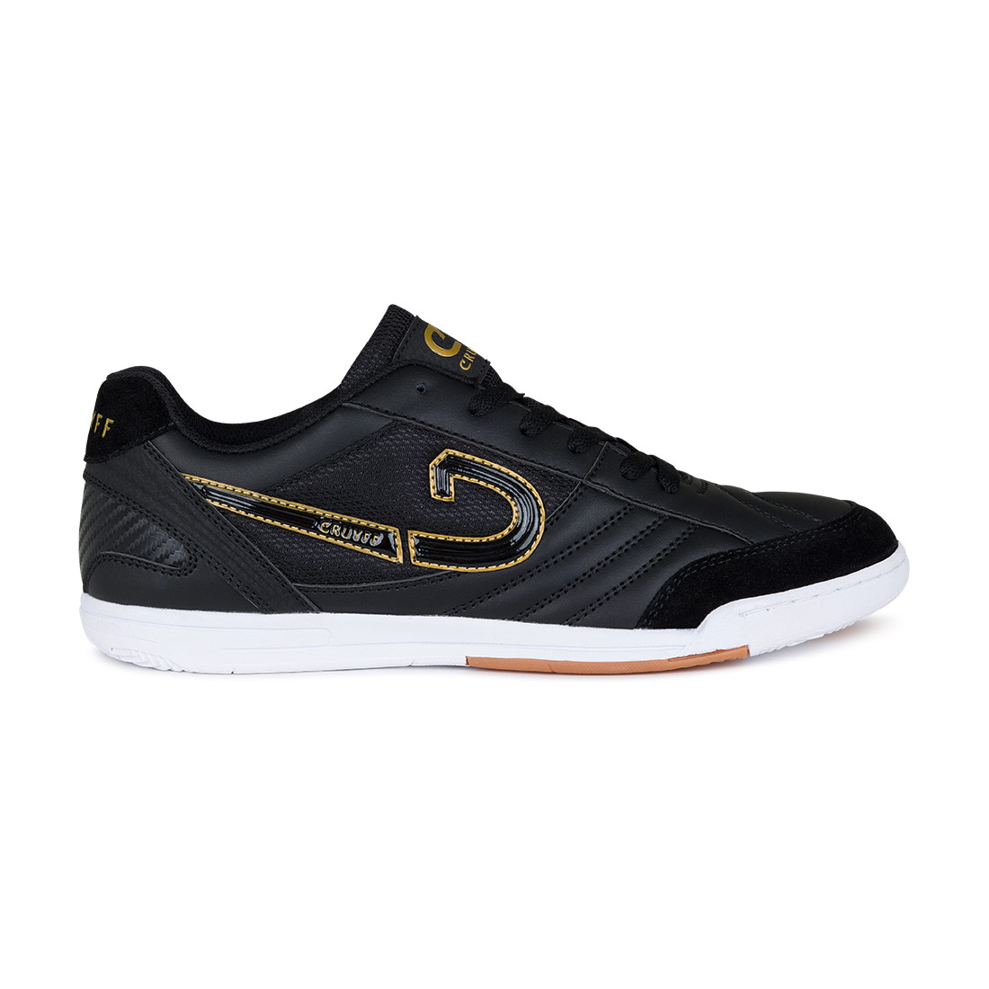 The Cruyff Libra (indoor football) shoes are black and feature the Cruyff C-Flash logo on the sides. The leather upper of the Cruyff futsal shoes ensures an ultimate fit. The Cruyff Libra is a functional (indoor football) shoe for both indoor and outdoor (indoor/street) use. The combination of suede with technical leather and an EVA insole, which provides an optimal fit and ultimate ball control, makes this shoe an absolute top shoe. The shoe has been specially developed in Italy for the demanding player and is therefore functional in nature. It is true that it is also great to wear next to the field! Breathable insole and lining Technical mesh on the side for optimal ball feel and ventilation, anatomical fit for optimal comfort, strong heel cap for extra stability and protection, flexible and sturdy non-marking outsole.