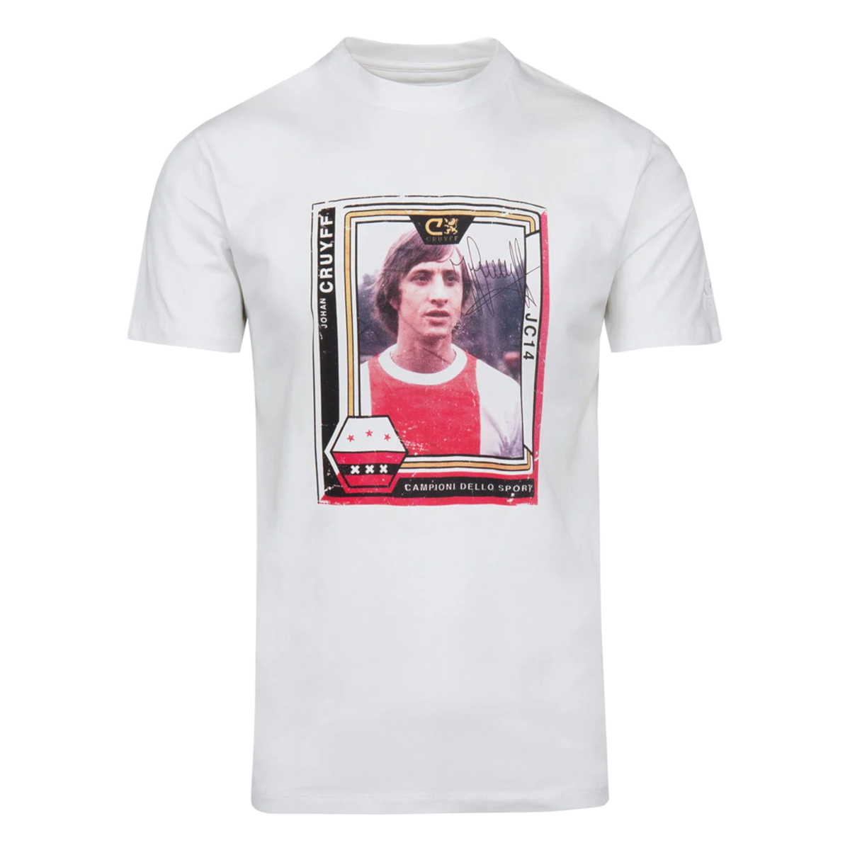 Cruyff Amsterdam t-shirt in white for adults. This Cruyff t-shirt features a cool photo print of Johan Cruijff in Ajax's kit on the front. Johan played for the Amsterdam football club for two different periods and achieved many great successes. The Cruyff Memorial Amsterdam t-shirt is also completely white and has a round neck. Wonderfully stylish Cruyff t-shirt for the true Ajax and Cruijff fan! The t-shirt has a regular fit. Material: 95% cotton - 5% elastane.
