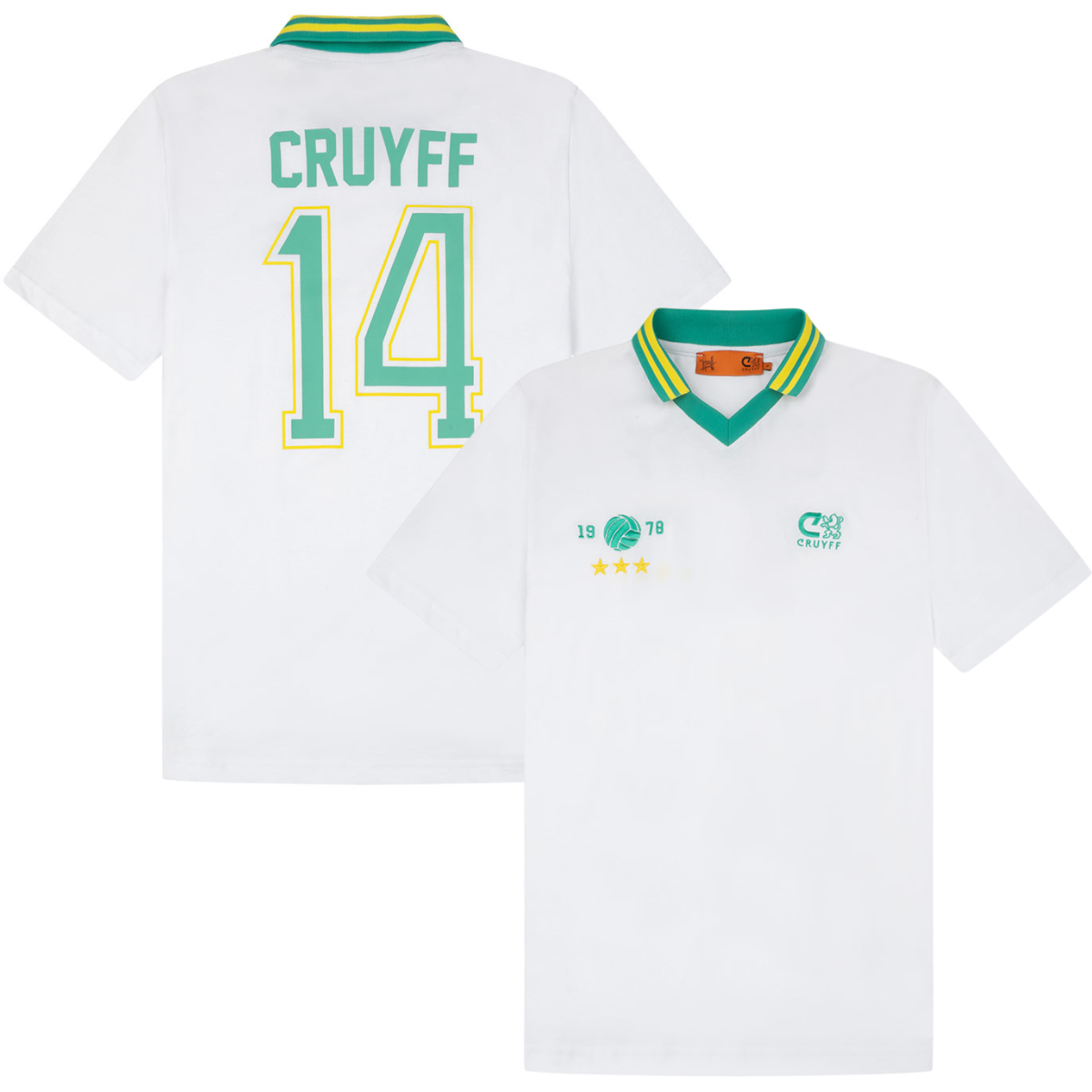 The design combines a classic white base with striking green and yellow details. The green V-neck and polo collar with subtle yellow stripes give the shirt an authentic vintage look. The iconic number 14 is featured on the back. The right chest displays three stars with the year 1978 and a retro ball, while the left chest features the recognizable Cruyff logo.
