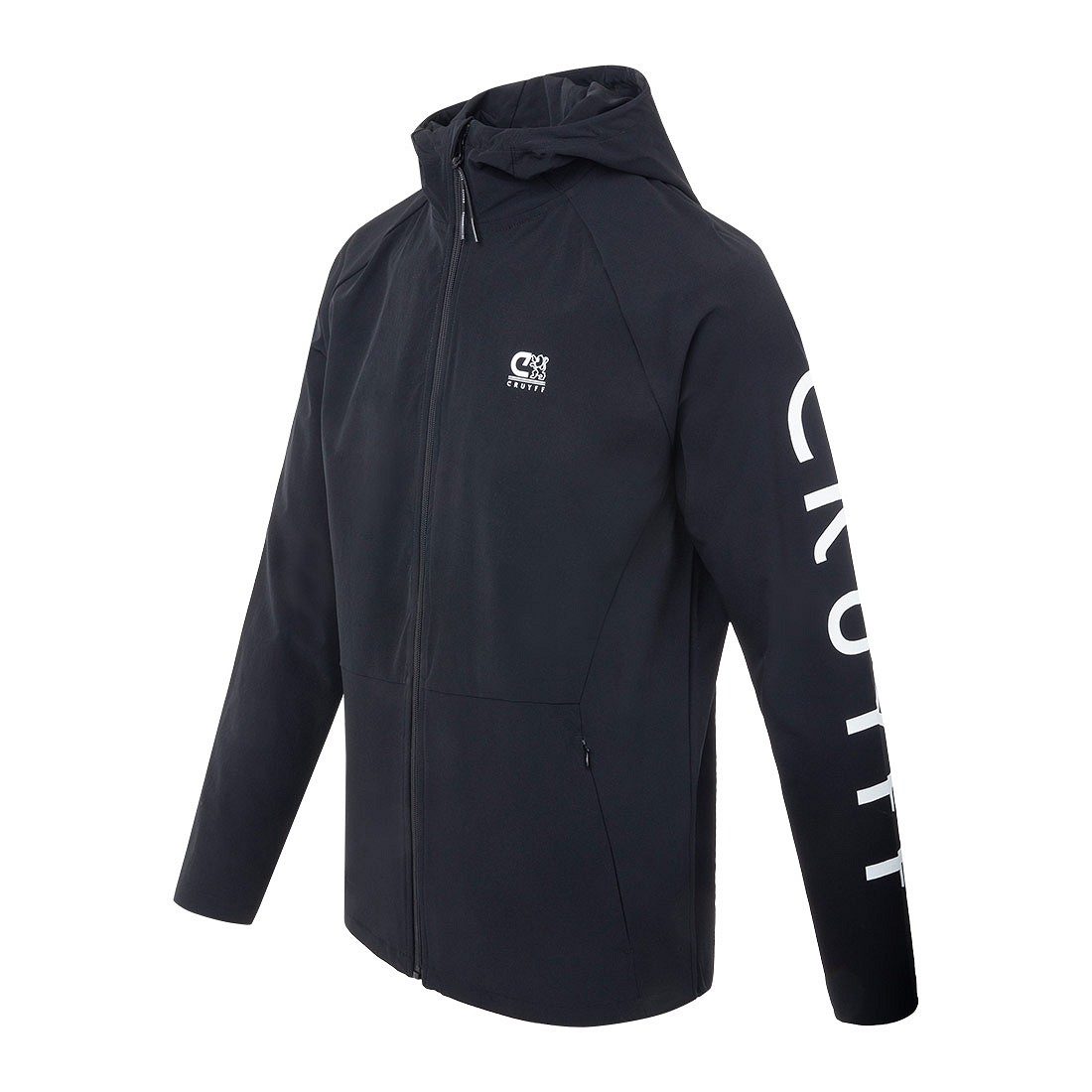 Sporty Windbreaker from Cruyff Sports in black for men. The jacket is completely in black and contains some white details. The Cruyff Windbreaker has a hood and two zippered pockets. The Cruyff C-Lion logo is on the left chest and the name of the brand is printed large on the left sleeve. Ideal Windbreaker jacket from Cruyff to help you against the wind. The Cruyff Windbreaker has a normal fit. Material: 90% Polyamide & 10% Elastane.