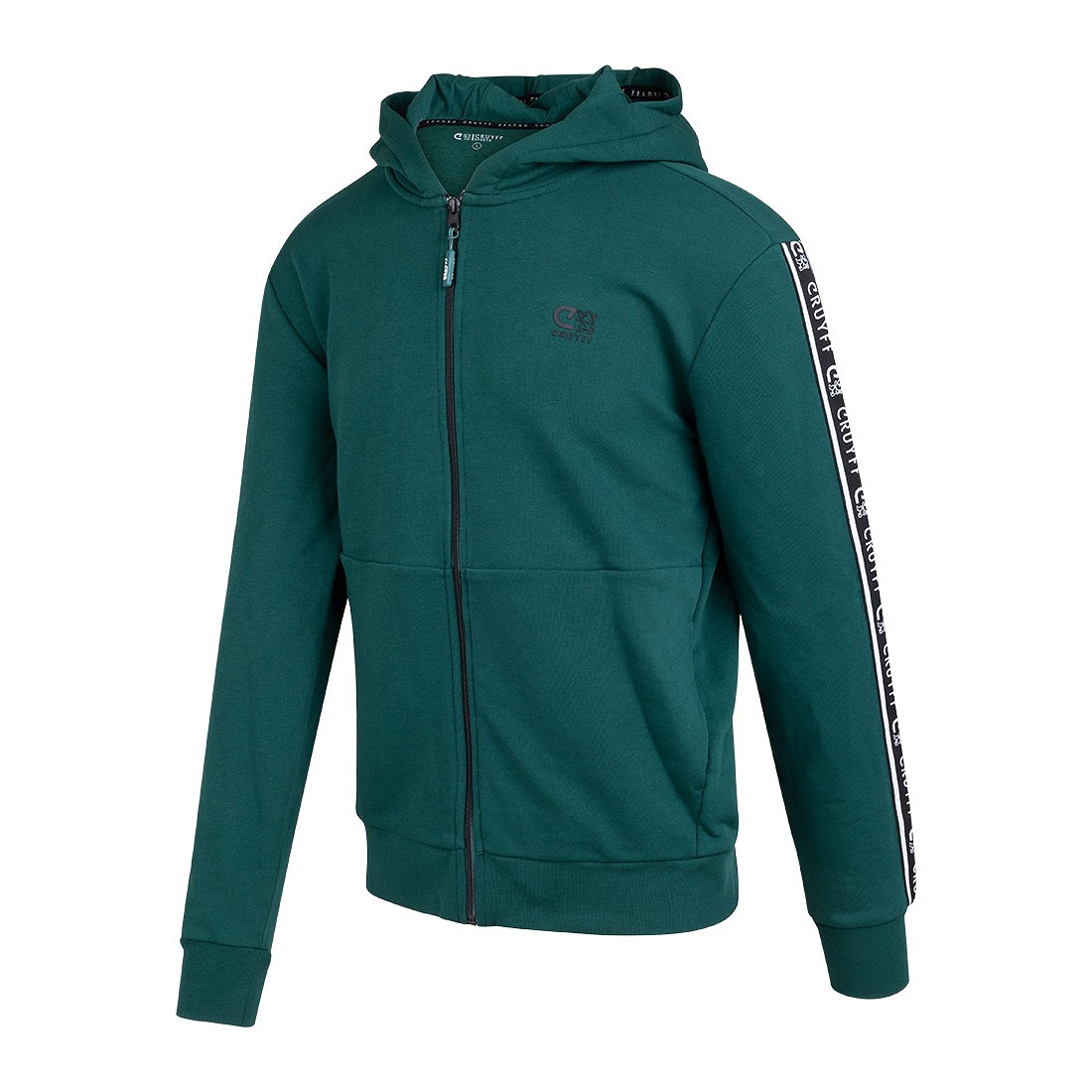 Sporty Cruyff Sports hooded training jacket for men. The Cruyff jacket is in dark green and has a hood. The Cruyff training jacket is characterized by the black and white taping on both sleeves. The taping bears the name of the brand and the Cruyff logo. The left chest contains the Cruyff logo in black. The taping over the sleeves gives the track jacket a sporty look. The Cruyff jacket from the Cruyff Sports collection has a normal fit. Material: 80% cotton - 20% polyester.