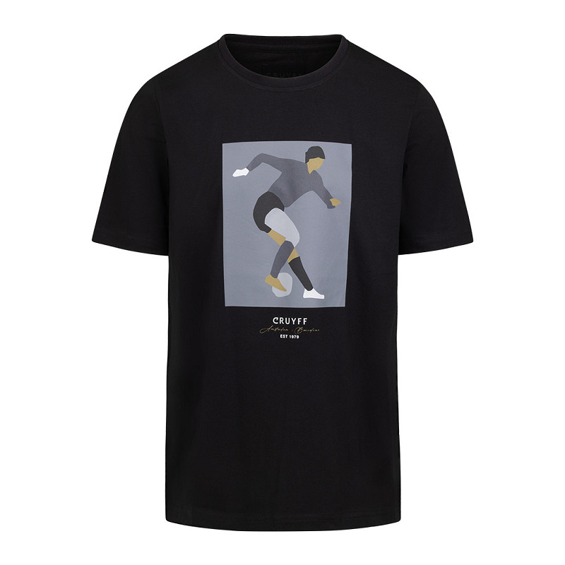 Cruyff t-shirt in black for adults. This Cruyff t-shirt features a graphic print of the Cruijff turn on the front. The Cruyff turn is an evasive dribbling move named after Johan Cruijff. In the 22nd minute of the match against Sweden in the group stage of the 1974 World Cup, Cruijff had the ball in an attacking position and was tightly covered by Swedish defender Jan Olsson. Johan Cruijff pretended to pass, but dragged the ball behind his standing leg, turned 180 degrees and sped away. The Cruyff turn is a simple, effective and unpredictable feint in football. Furthermore, the Cruijff Turn t-shirt has a round neck. Wonderfully stylish t-shirt from Cruyff for the real fan! Material: 95% cotton & 5% elastane.