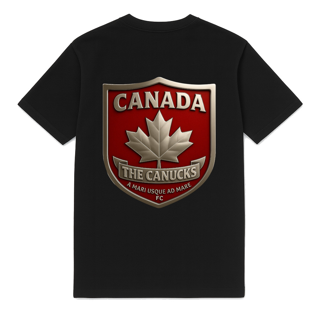 Cool Canada football T-shirt from FC ELEVEN for adults. This heavy T-shirt is made of heavyweight organic cotton. The back of the T-shirt features a print of a Canadian shield with a 3D maple leaf, the name of the country, the motto, and the nickname of the national team: The Canucks! The combination of red and gold gives this print an elegant look. On the left chest, the T-shirt is finished with the initials of the FC brand in black as a silicone logo.