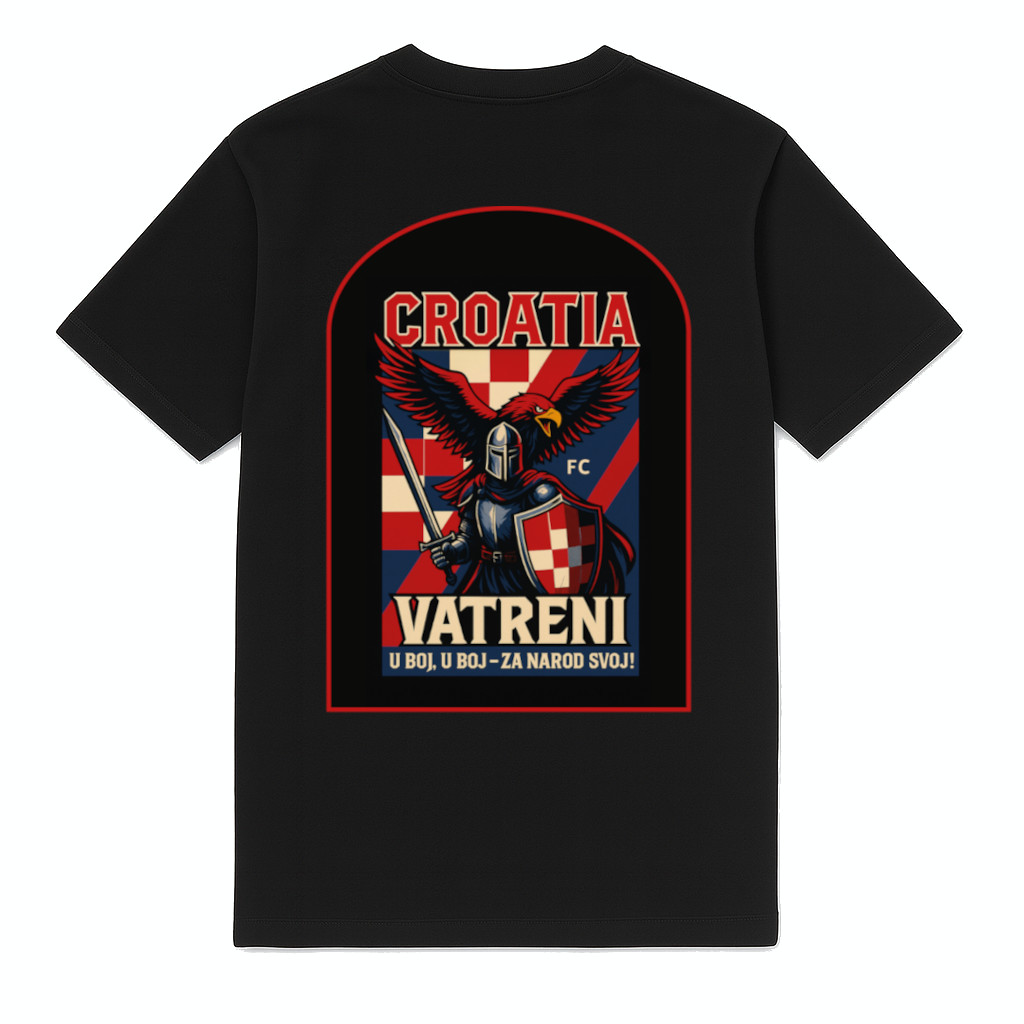 Cool Croatia football T-shirt from FC ELEVEN for adults. This heavy T-shirt is made of thick organic cotton. A striking feature of the shirt is the colorful graphic print of Croatia. In a typical Croatian shield, we see a warrior with the national eagle in the background, set against the red/white checkerboard from the country’s flag. The T-shirt not only includes the name of the country (CROATIA), but also the nickname (Vatreni) and the motto! The shirt is further decorated with the brand initials “FC” in black on the left chest, applied as a silicone logo. The heavy T-shirt is fully black with a crew neck. Made of heavy cotton and featuring a regular fit. Material: 100% organic cotton.