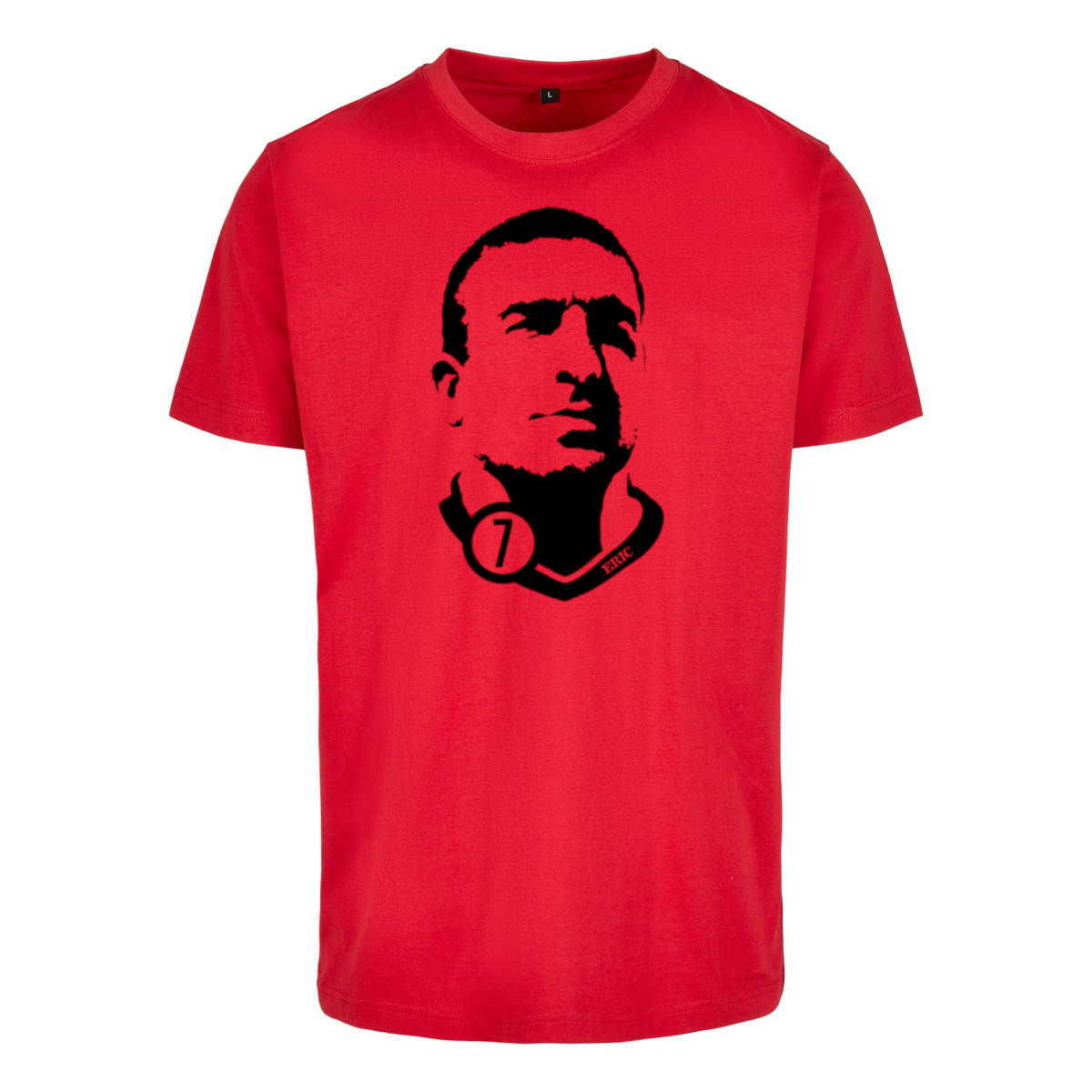 Eric Cantona t-shirt for men. Cantona is a former professional footballer and football legend from France. He ended his football career at Manchester United, where he won four English league titles and the FA Cup twice (in five seasons). Cantona is seen as an important player in the return of Manchester United as a football superpower. In 2000 he was voted the club's player of the century and he is still known there as "Eric the King". As a player sometimes inimitable, unfortunately also in his behavior sometimes. Cool red t-shirt with a print of Cantona's head. The t-shirt has a normal fit. Material: 100% cotton.