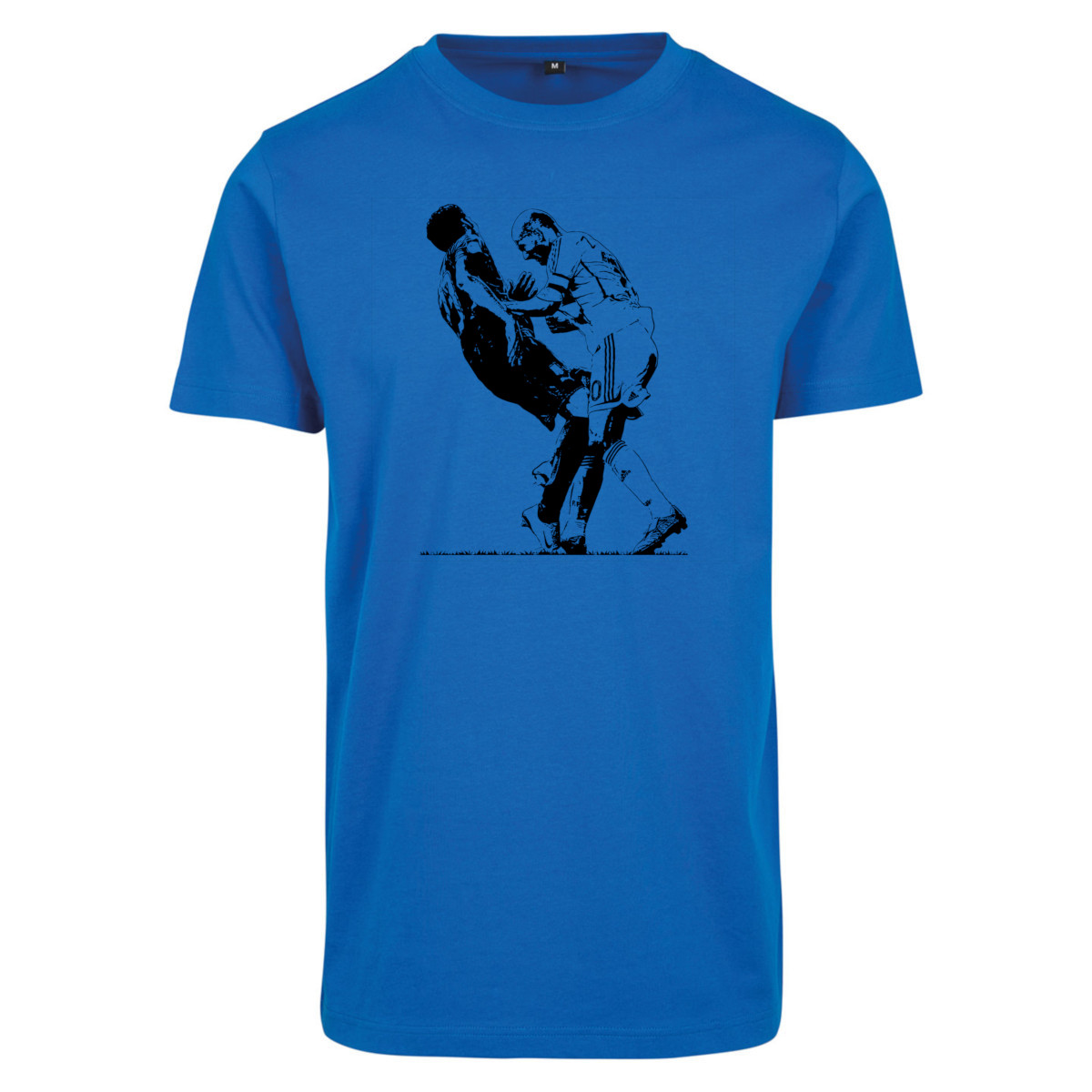 Cool FC Eleven crewneck t-shirt about the famous incident between Materazzi and Zidane. During the World Cup final in 2006, Zidane and Materazzi got into a fight. In extra time of the final, Zidane headbutted Materazzi. Zidane received a red card from Horacio Elizondo for this. It was Zidane's last match. The final was eventually won by Italy after penalties. The blue t-shirt has a print of Zidane's headbutt on the front. In addition, the t-shirt has a round neck and has a normal fit. Material: 100% cotton.