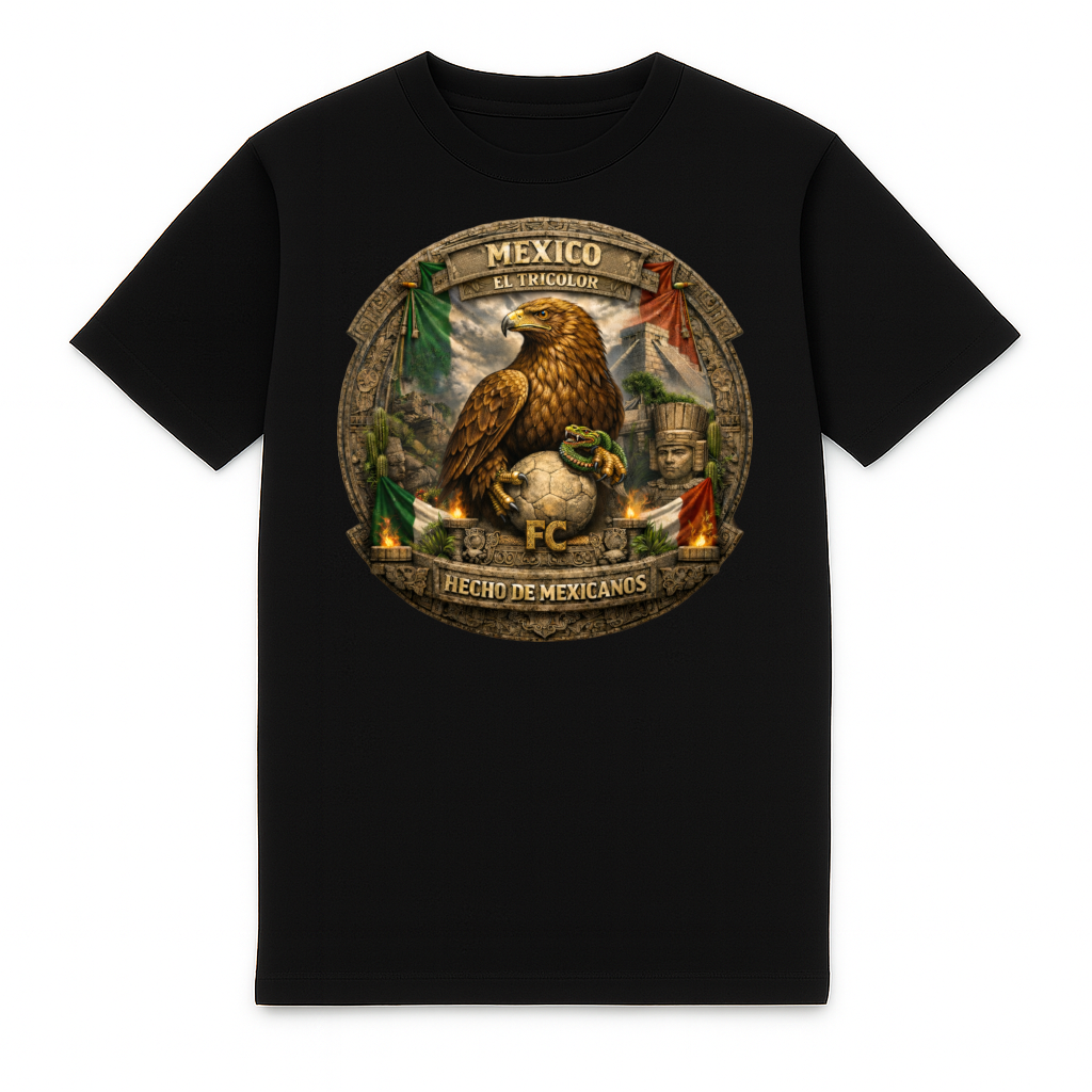 Cool Mexico football T-shirt by FC ELEVEN for adults. This heavy T-shirt is made from heavyweight organic cotton. A standout feature is the graphic Mexico print on the back. The print includes the texts Mexico, El Tricolor and Hecho de Mexicanos, with an eagle in the center holding a snake and a football. On the left chest, the initials FC are displayed in black as a silicone logo. The heavy T-shirt is fully black and features a round neckline. It is made from heavy cotton and has a regular fit.