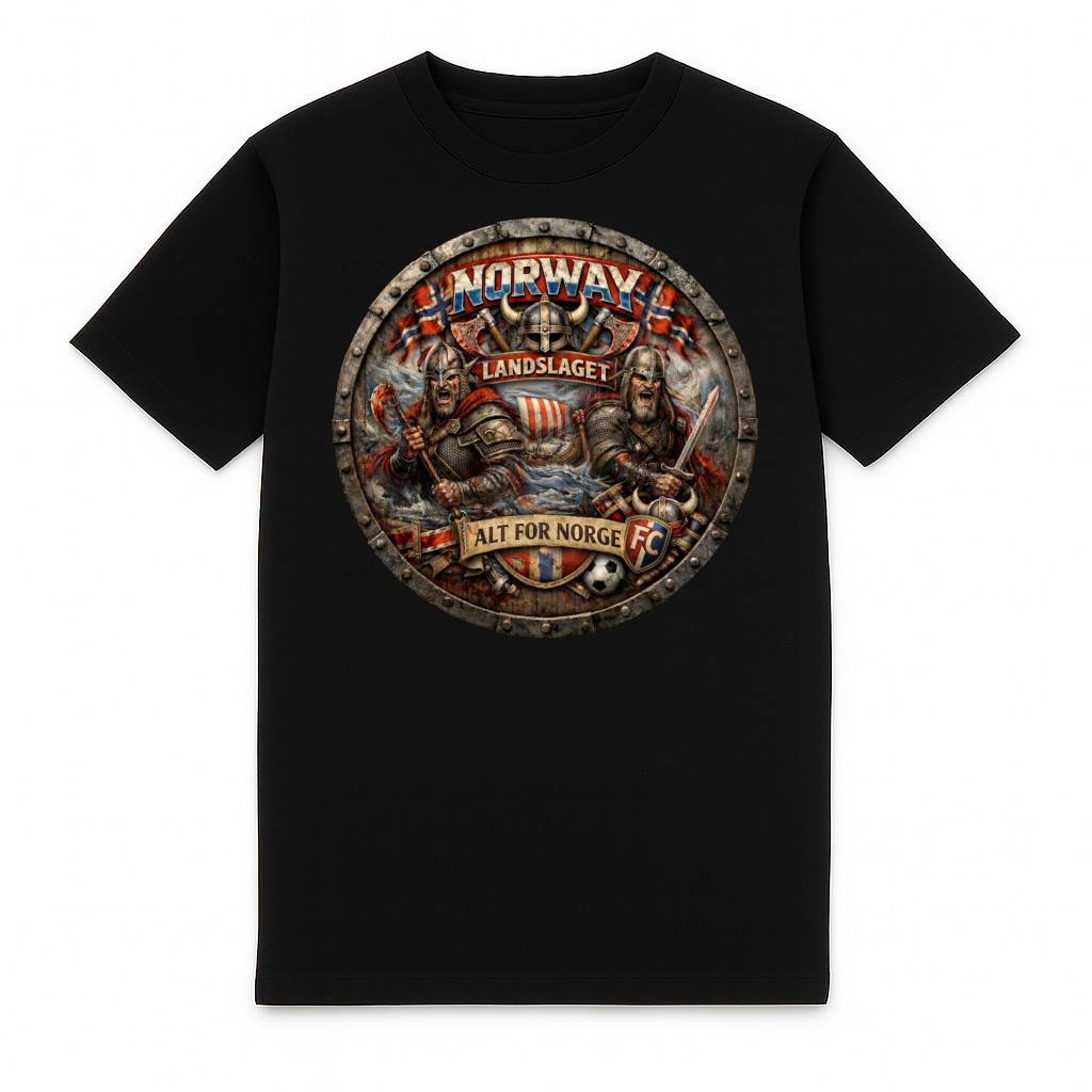 Stylish Norway heavy T-shirt for adults by FC ELEVEN. This heavy T-shirt is made from thick organic cotton. The back of the T-shirt features a print of a shield with a 3D print of Norwegian Vikings and Norwegian flags in the background. The print is fully styled in the national colors of the country and is red and white. The print also includes the texts Landslaget and Alt For Norge. Created to support the Norway national team. The T-shirt also features the FC brand initials in black on the left chest. This is a silicone logo. The heavy T-shirt is completely black and has a round neckline. The T-shirt is made of heavy cotton and has a regular fit. Material: 100% organic cotton.