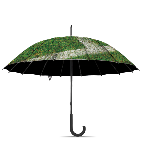 Along the line in the pouring rain… No problem, unfold your 'Grassmat' and enjoy the slidings. The round handle provides a firm grip. The umbrella is unfolded by means of a button on the handle. The umbrella is tied together by a Velcro closure and comes with a colorful back number cover with iconic FC Kluif pennant.