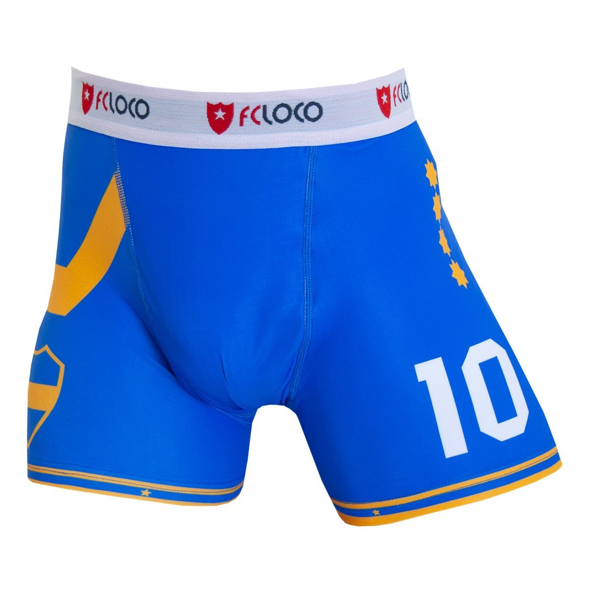 Boca Juniors in the 80s and 90s. The boxer shorts are completely blue and contain a zigzag track in yellow on the right side and back. The silhouette of the Boca logo adorns the left leg and the left side contains four stars. The four stars were the logo of the club in the 1980s. The boxer shorts have number 10 on the left leg, Diego Maradona's number! Maradona played for Boca Juniors in 1981-1982 and 1995-1997. Bronca stands for struggle! This FCLOCO boxer is available exclusively at Sportus. Get these unique FCLOCO boxer shorts quickly!