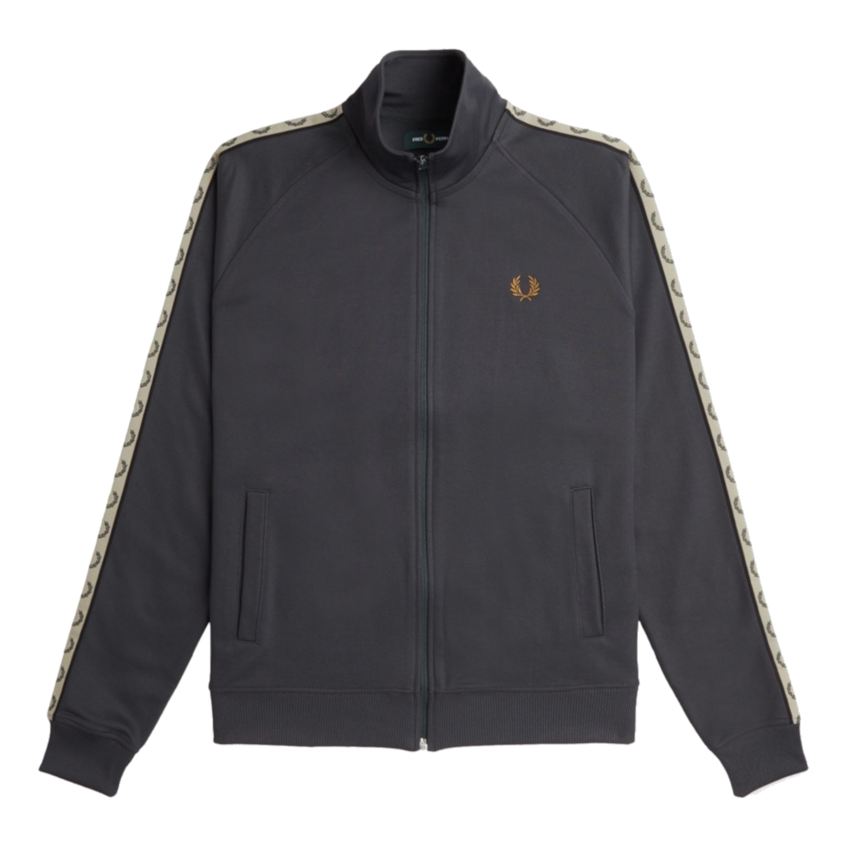 Sporty Fred Perry contrast tape track jacket in dark gray (Anchor Grey) for men. The Fred Perry training jacket is a nice combination of streetwear and sports. The Fred Perry logo is in gold on the left chest. The Fred Perry jacket is characterized by the gray with black taping over both shoulders and sleeves. This taping shows the Fred Perry logo in black. The tape over the sleeves gives the Fred Perry jacket a sporty look. The training jacket also has two side pockets. The Fred Perry training jacket has a normal fit.