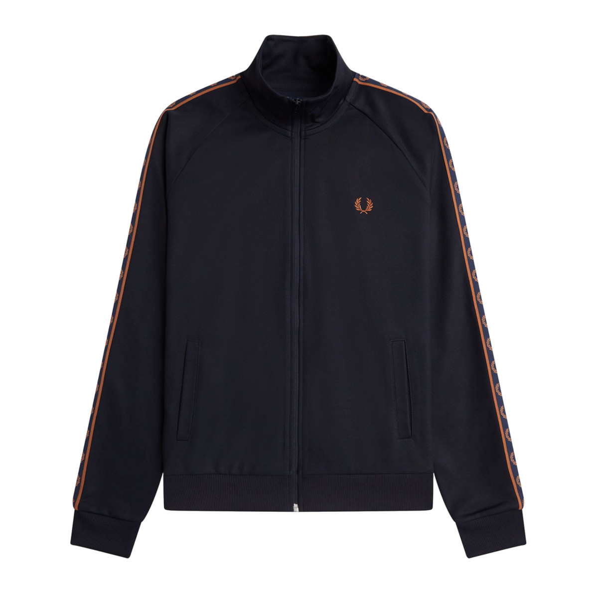 Fred Perry contrast tape training jacket in dark blue for men. The jacket has a sporty design and the left chest contains the Fred Perry logo. The Fred Perry taped training jacket is characterized by the orange/brown (nut flake) taping over both shoulders and sleeves. The Fred Perry emblem is applied to this tape. The taping over the sleeves gives the Fred Perry training jacket a cool and sporty appearance. Furthermore, the training jacket has a high neck and two side pockets. The Fred Perry training jacket has a normal fit.