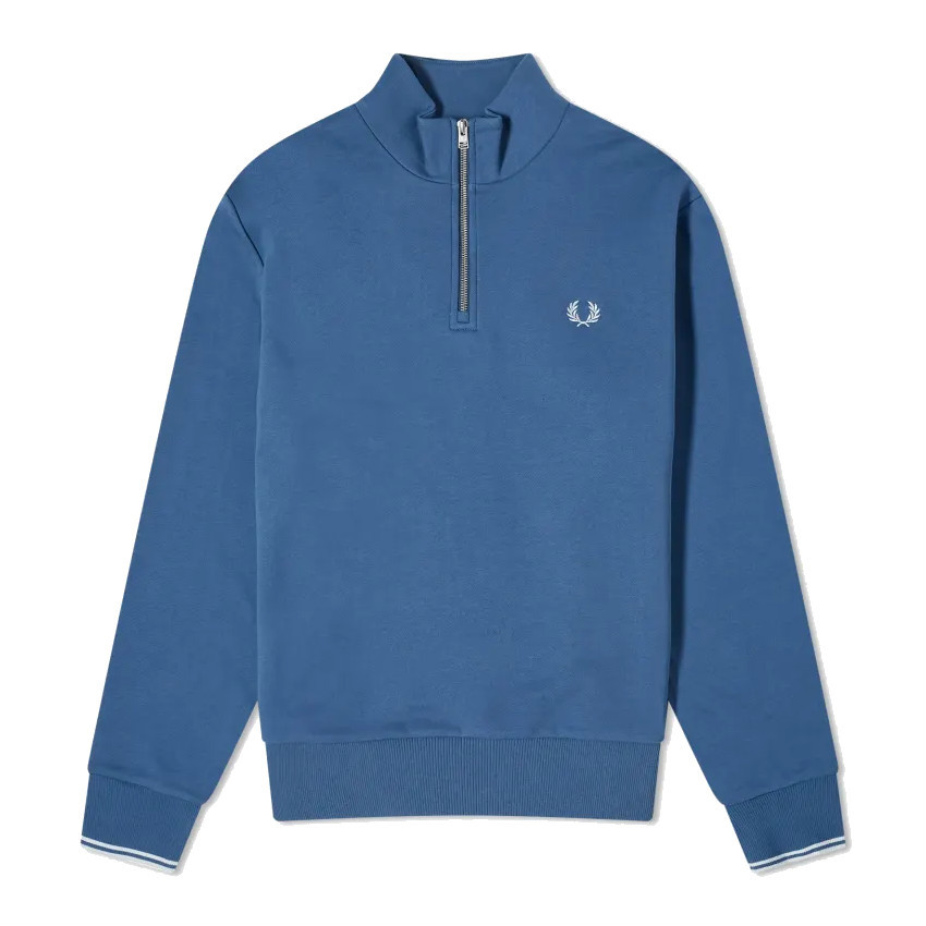 Fred Perry Half Zip sweater in blue (Midnight Blue) for men. Sporty design with the Fred Perry logo on the left chest. The Fred Perry sweater has a zipper up to the chest and the bottom of the sleeves have a double stripe. The two stripes refer to the well-known twin tipped polo shirts from Fred Perry. The sweater is a nice combination of sports and streetwear. The Half Zip sweater from Fred Perry has a regular fit. Material: 79% cotton - 21% polyester.