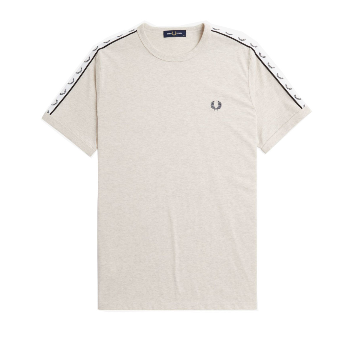 Sporty Fred Perry t-shirt in the color 'Porridge Marl' for men. This t-shirt has a round neck and is characterized by the white taping over both shoulders and sleeves. The well-known laurel wreath of Fred Perry is applied to this tape. This Fred Perry logo is also applied in black on the left chest. This logo and the taping over the sleeves gives the Fred Perry t-shirt a real vintage sportswear look like in the 90s. A wonderful t-shirt from the Sports Authentic collection of the English brand. The Fred Perry Contrast Tape Ringer t-shirts have a normal fit.