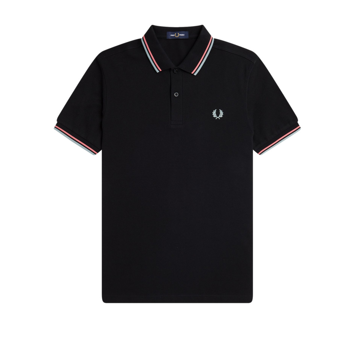 Fred Perry polo shirt for men in black. The black polo is from the well-known Twin Tipped model by Fred Perry. The two stripes at the piping and collar are in the colors 'Coral Heat' & 'Silver Blue'. This color combination provides a fresh and classic look. On the left chest the well-known laurel wreath logo of Fred Perry in silver blue. The Fred Perry polo shirt from the twin tipped collection has a sublime fit that does not disappear even after many washes. The fashionable Fred Perry polos have the retro tennis design that every sports fashion fan loves. Naturally, the cotton used is of very good 'cotton pique' quality. The Fred Perry polo fits perfectly over your jeans, chino pants or shorts during the warm days of the year. The Fred Perry polos are available in various popular colors. The Fred Perry Twin Tipped polo shirts collection fits comfortably and normally on the body. Material: 100% cotton pique.