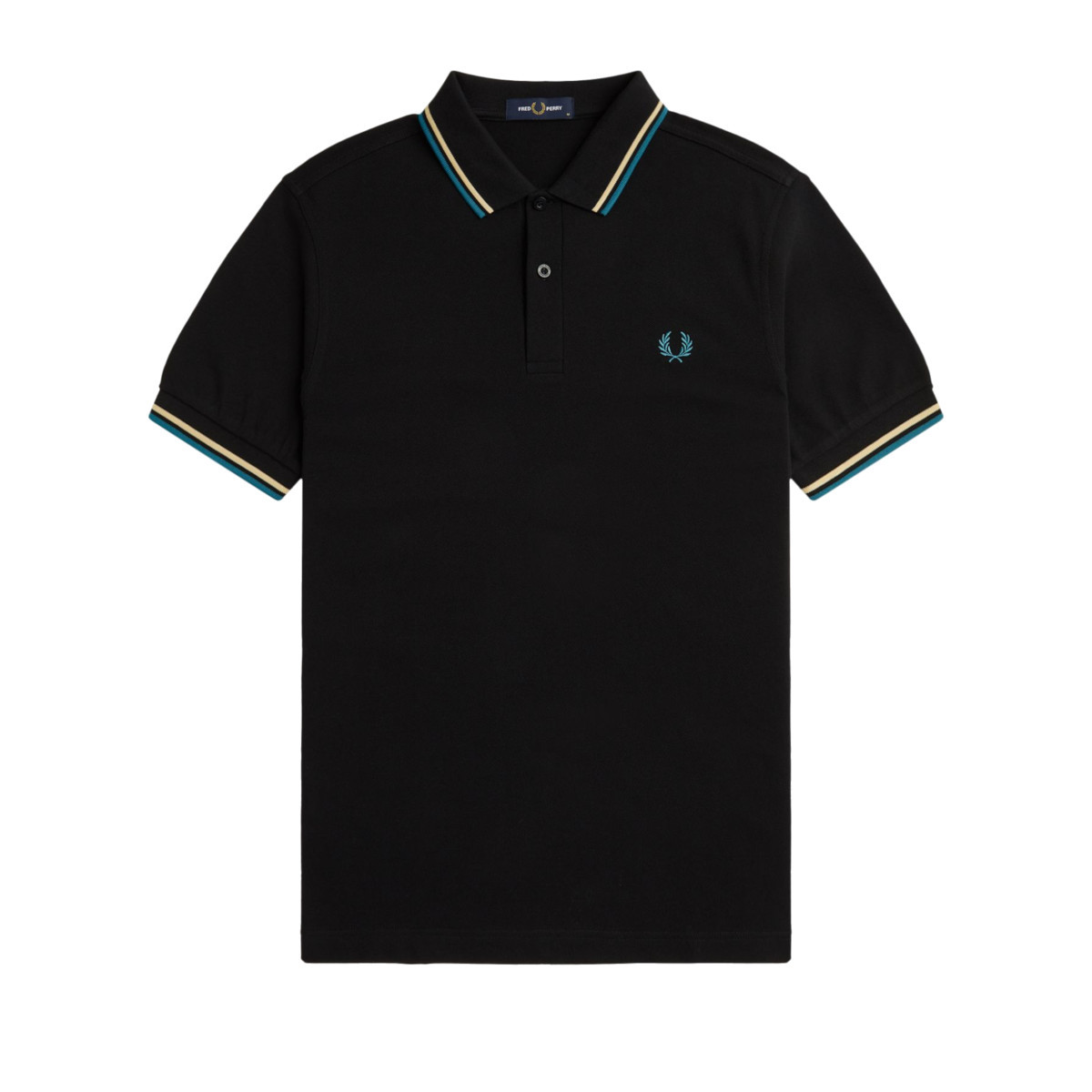 Fred Perry polo shirt in black for men. The Fred Perry polo is the well-known Twin Tipped model. The two stripes at the piping and collar are in the colors 'Ice Cream' and 'Cyber Blue'. This color combination provides a classic and fresh look. Fred Perry's famous laurel wreath logo on the left chest. The Fred Perry polo shirt from the twin tipped collection has a nice fit that does not disappear even after many washings. The fashionable Fred Perry polos have the retro tennis design that every sports fashion fan loves. Naturally, the cotton used is of very high quality. The Fred Perry polo fits perfectly over your jeans, chino pants or shorts during the warm days of the year. The Fred Perry polos are available in various popular colors. The Fred Perry Twin Tipped polo shirts collection fits comfortably and normally on the body. Material: 100% cotton pique.
