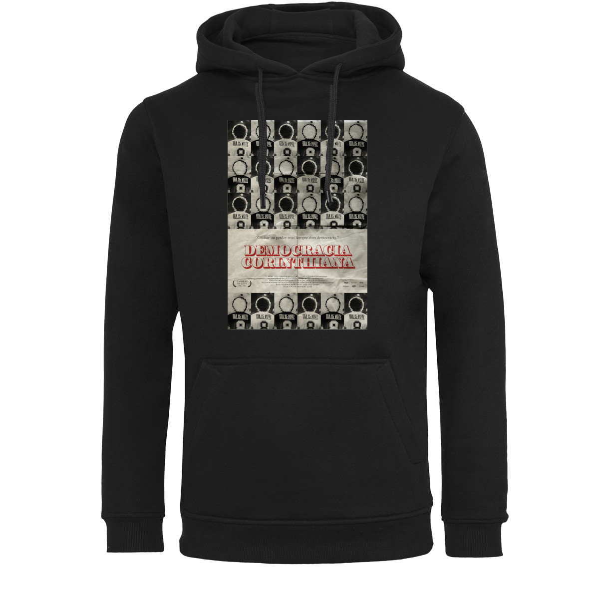 Cool hoodie in black for adults. The hoodie is an ode to Democracia Corinthiana. In the middle of the chest is a cool print of one of the most striking and important decisions of Corinthians Paulista, the Democracy of Corinthians. In 1982, players such as Socrates and Wladimir were given permission by the football club (club chairman Walemar Pires) to make decisions about the club. An example of this was that the players printed their football shirts with political messages. The design shows a historic moment from the history of football on a film poster.